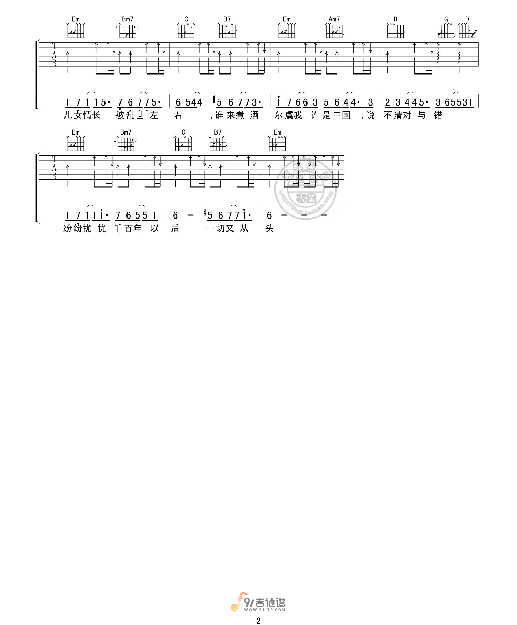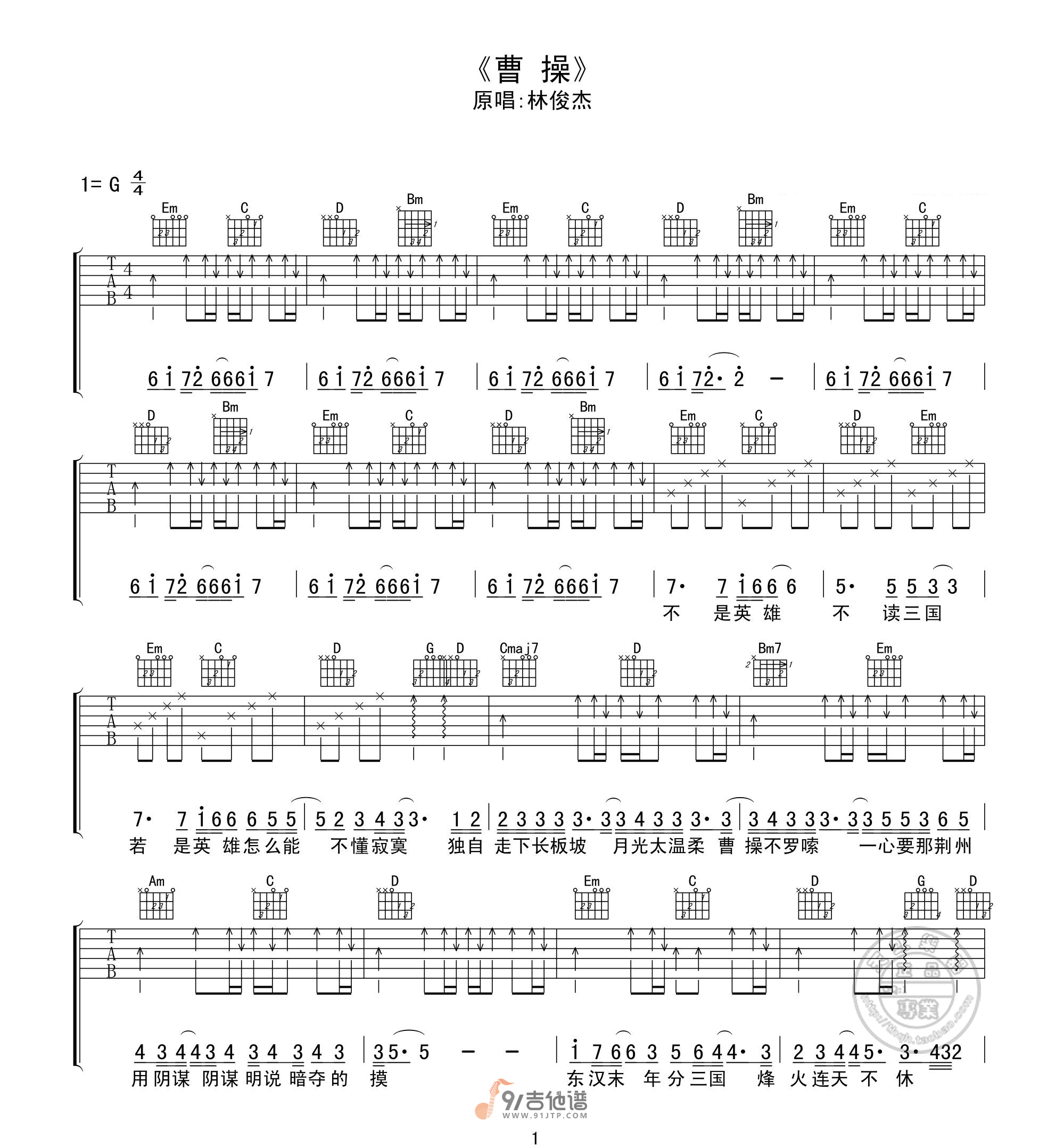 曲谱介绍: 曲谱简介:曹操吉他谱,林俊杰演唱的一首歌曲,4/4拍的节奏,这首歌曲的原调为G调,这里曲谱采用了G调指法进行编配,演唱时可不夹变调夹,曲谱由琴谱网更新上传,共2张高清图片弹唱吉他谱例,曲谱来源于网络转载,编配制谱者暂不详。这首歌是一首摇滚曲风的劲歌, 也是林俊杰首次尝试摇滚的风格,雄劲突破了林俊杰以往亲切的R&B小王子的形象。