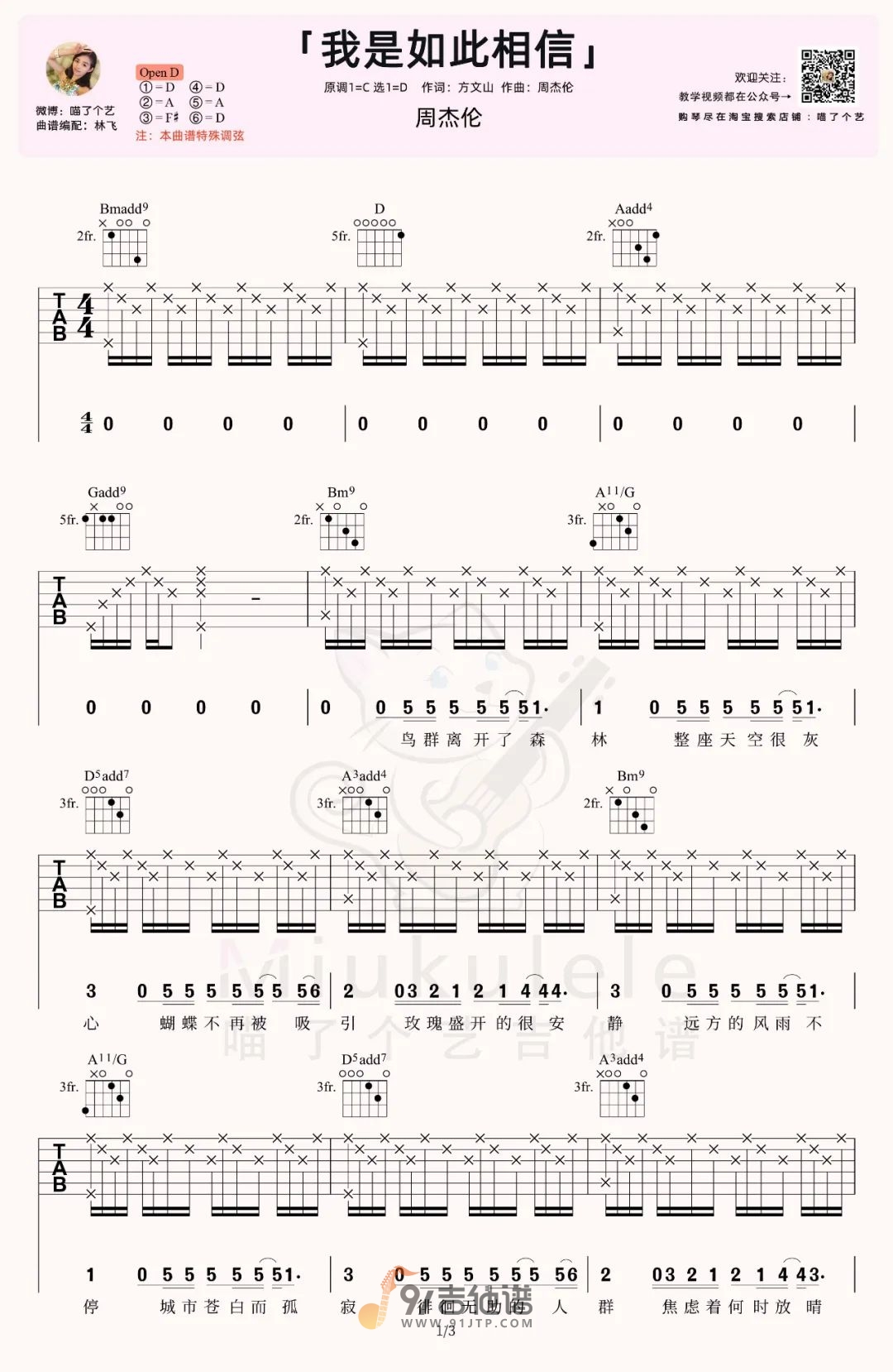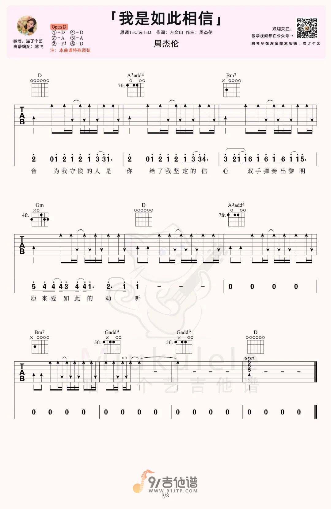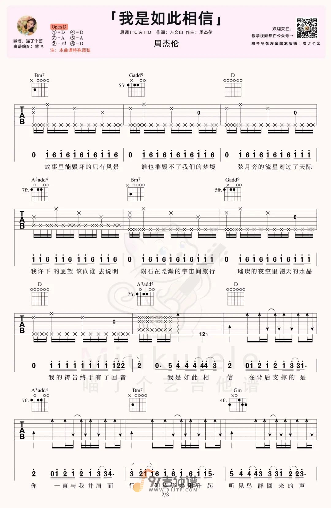 曲谱介绍: 曲谱简介:我是如此相信吉他谱,周杰伦演唱的一首歌曲,4/4拍的节奏,这首歌曲的原调为C调,这里曲谱采用了D调指法进行编配,演唱时可根据个人情况选择变调夹,曲谱由喵了个艺编配出品。歌曲恢弘大气的管弦乐前奏缓缓而来,独特的周氏唱腔一开口就温暖了无数的人。这里编配为打板的版本,用到了特殊调弦,学习前请按谱上提示调音。