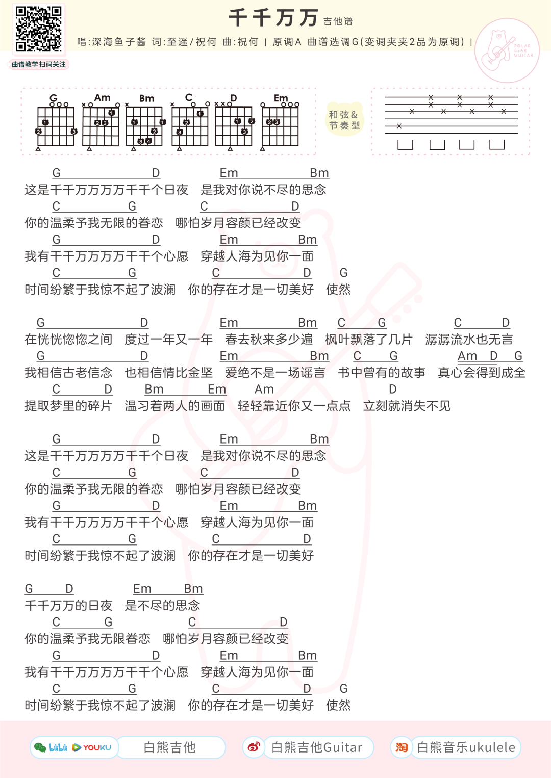 曲谱介绍: 深海鱼子酱《千千万万》吉他弹唱谱,采用G调指法编配,共有1张高清图谱,免翻页排版设计。
