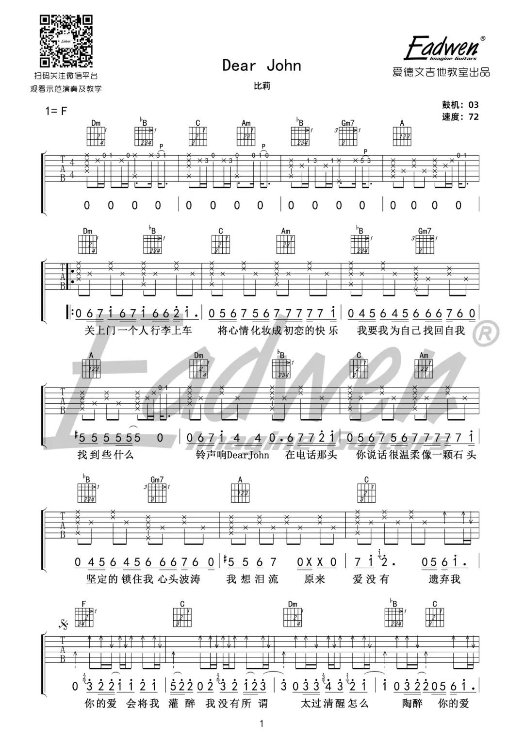 曲谱介绍: 比莉《DearJohn》吉他弹唱谱,采用F调指法编配,共有3张高清图谱。