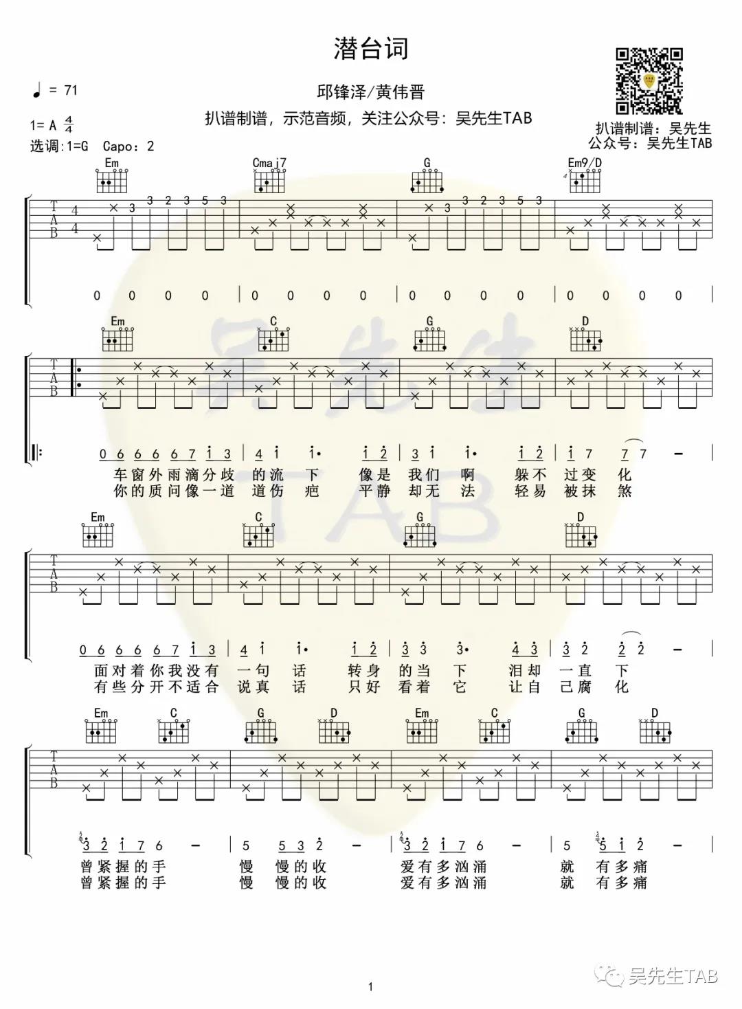 潜台词吉他谱 - 邱锋泽,黄伟晋 - G调吉他弹唱谱
