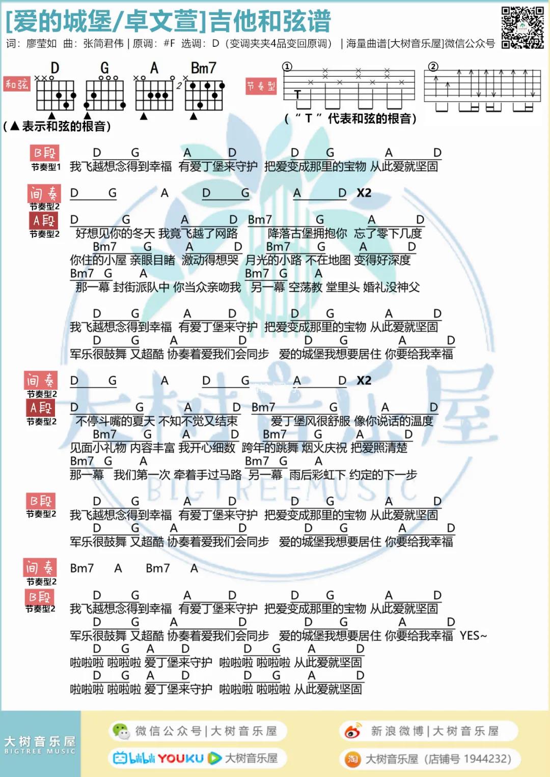 曲谱介绍: 卓文萱《爱的城堡》吉他弹唱谱,采用D调指法编配,共有1张高清图谱,免翻页排版设计。