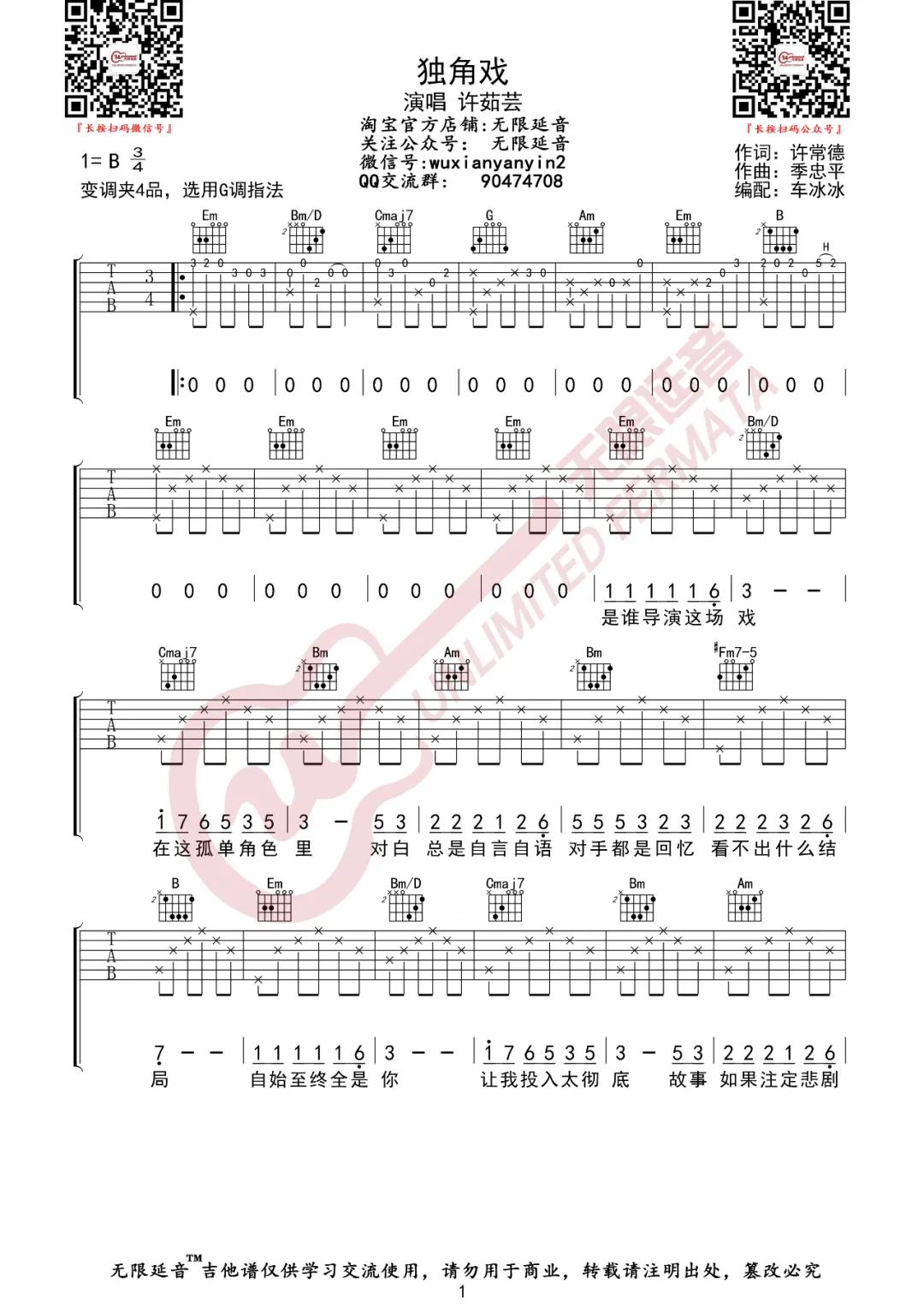 独角戏吉他谱 - 许茹芸 - G调吉他弹唱谱