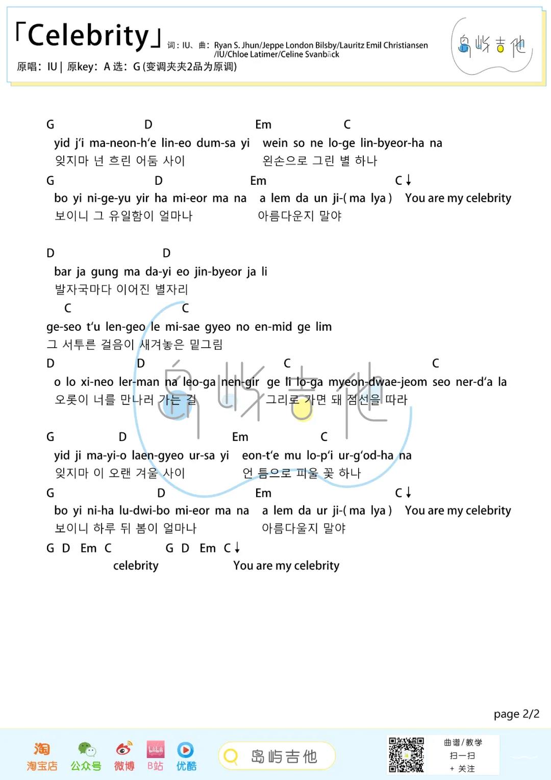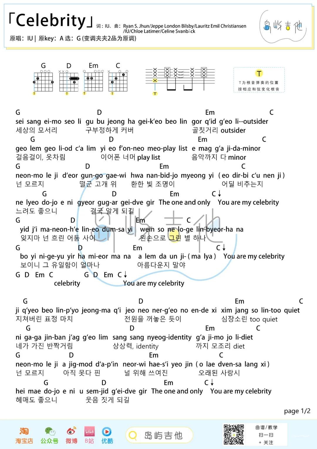 曲谱介绍: IU(李知恩)《Celebrity》吉他弹唱谱,采用G调指法编配,共有2张高清图谱,免翻页排版设计。