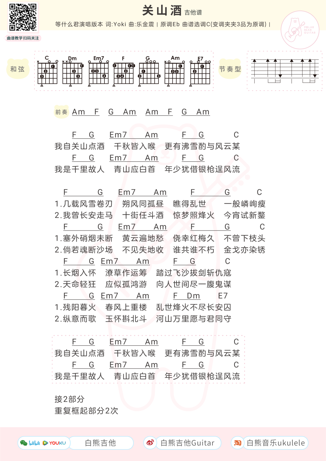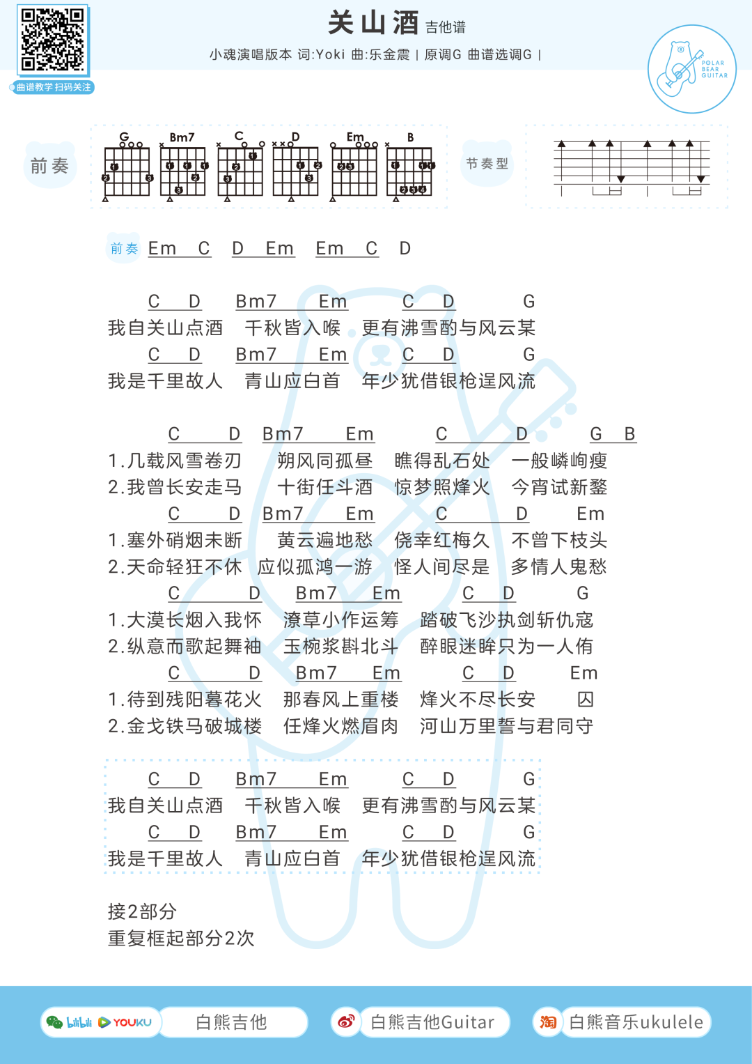 曲谱介绍: 〈关山酒〉由Yoki作词,乐金震作曲,小魂演唱的一首歌曲;发行于2019年9月3日。