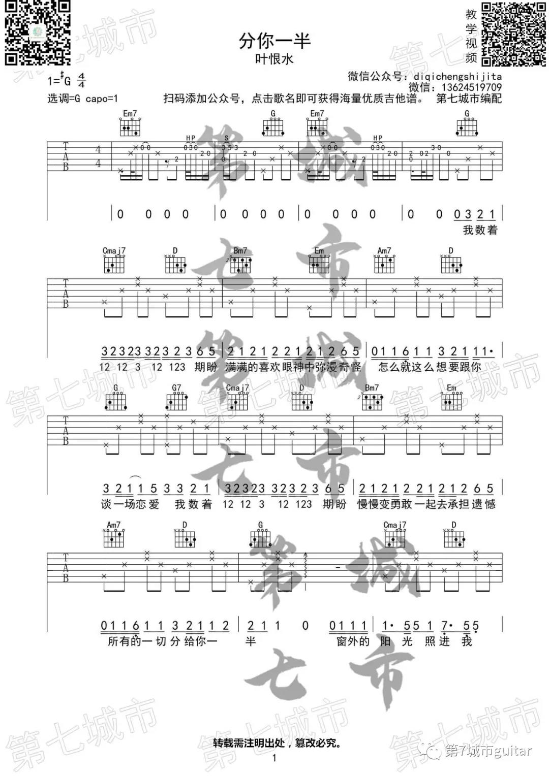 分你一半吉他谱 - 叶恨水 - G调吉他弹唱谱