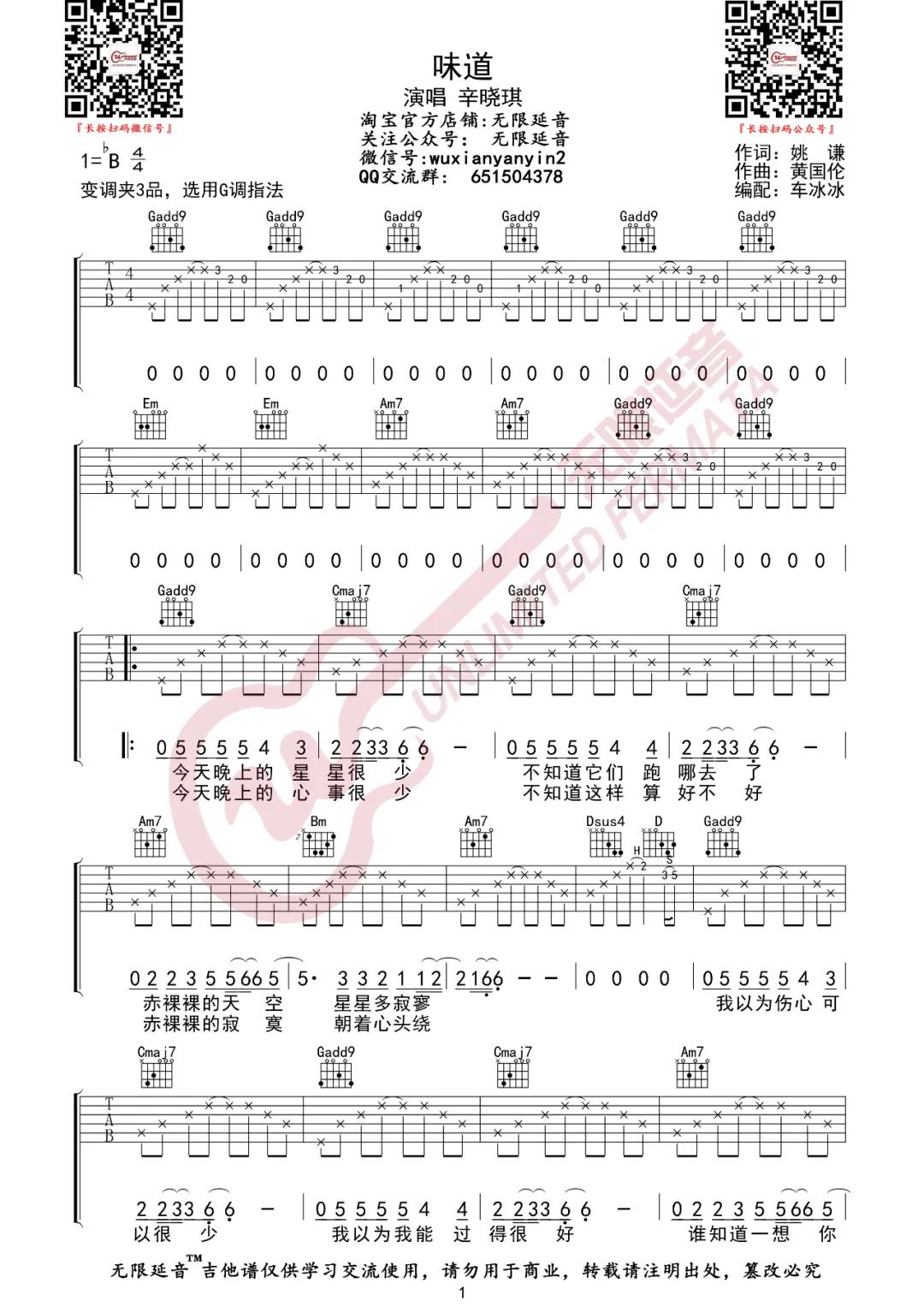曲谱介绍: 《味道》由姚谦作词,黄国伦作曲,辛晓琪演唱的一首歌曲。 辛晓琪出道至今,凭借《领悟》、《味道》等经典情歌陪伴了一代人的成长。辛晓琪的歌淋漓尽致地诠释世间百态的爱情,总能把情歌唱得直抵人心,让听歌的男人女人一次又一次得以灵魂共鸣,人们总是能在她的歌曲里找到自己的故事,印证自己的爱情。