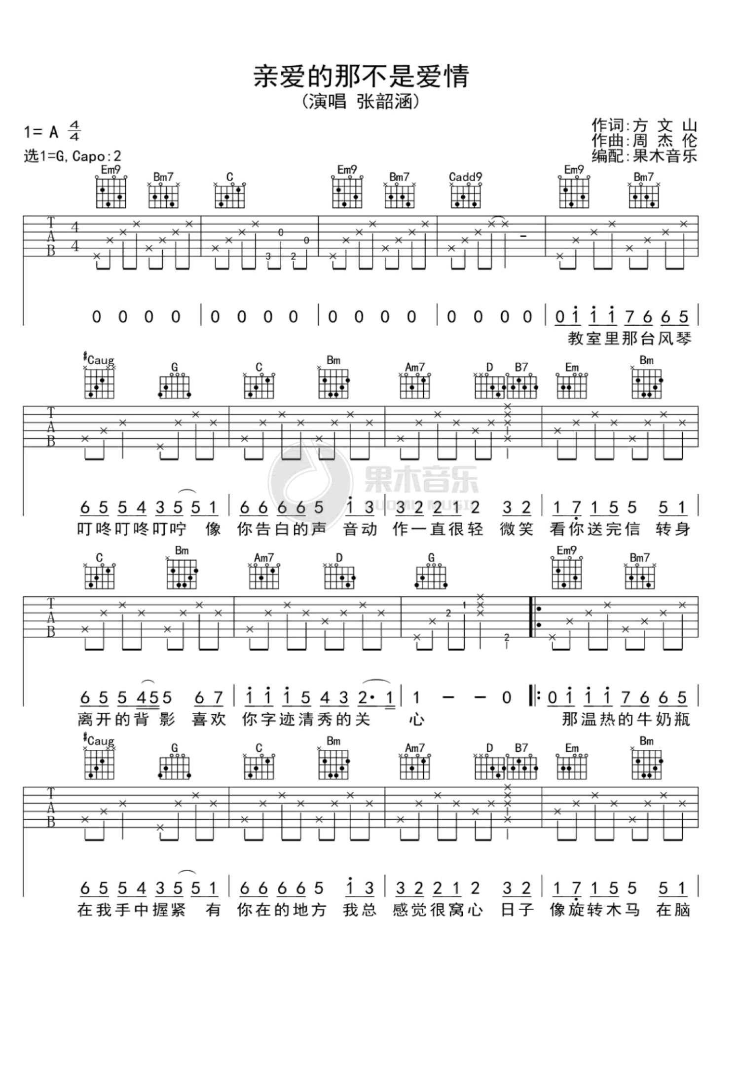 曲谱介绍: 亲爱的那不是爱情吉他谱,张韶涵演唱,一首由周杰伦为张韶涵特地量身打造经典老歌,亲爱的那不是爱情六线谱,原调A,选用G调指法,变调夹夹第二品,车间总是飘来那些听了很多年的歌,然后一发不可收拾地单曲循环,很多时候听的并不是歌,而是对青春岁月的怀念。那种怦然心动,会给你那些时光里不竭的动力。就像现在的我们想起过去的自己。