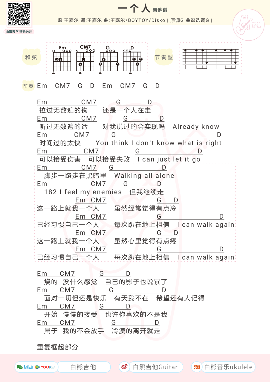 一个人吉他谱 - 王嘉尔 - G调吉他弹唱谱