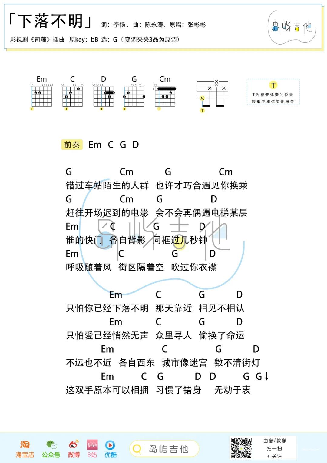 下落不明吉他谱 - 张彬彬 - G调吉他弹唱谱