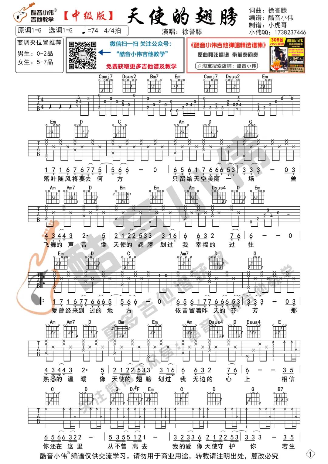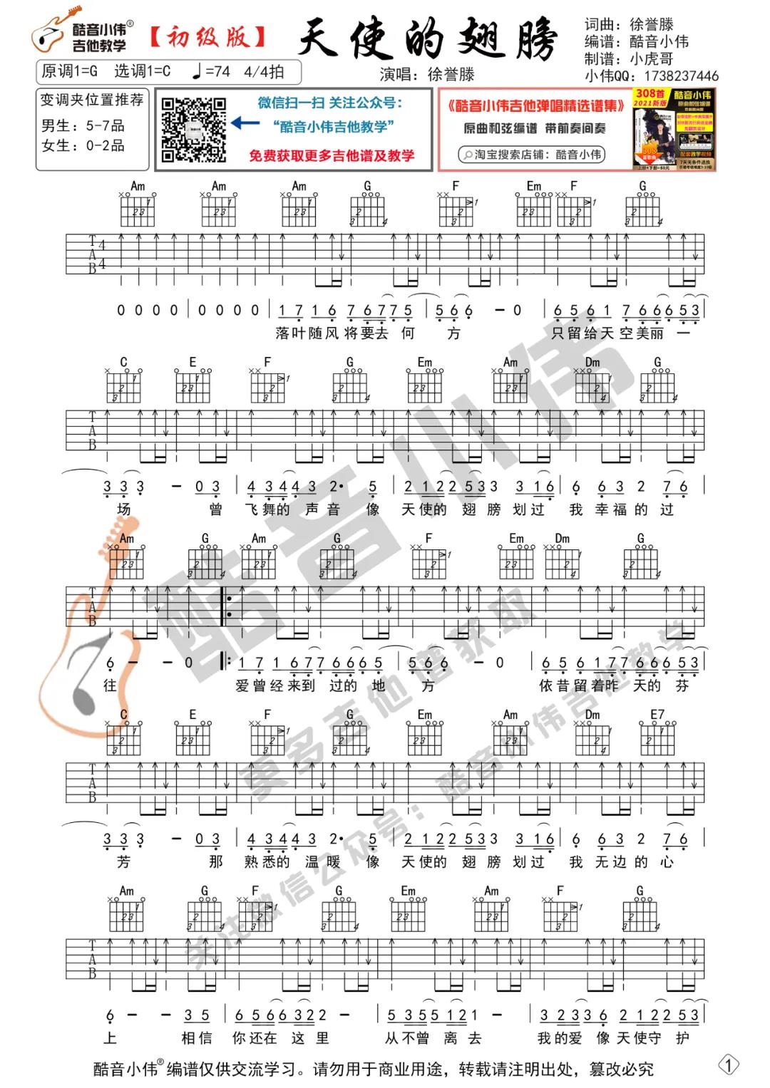 曲谱介绍: 徐誉滕《天使的翅膀》吉他弹唱谱,采用G调指法编配,共有4张高清图谱。