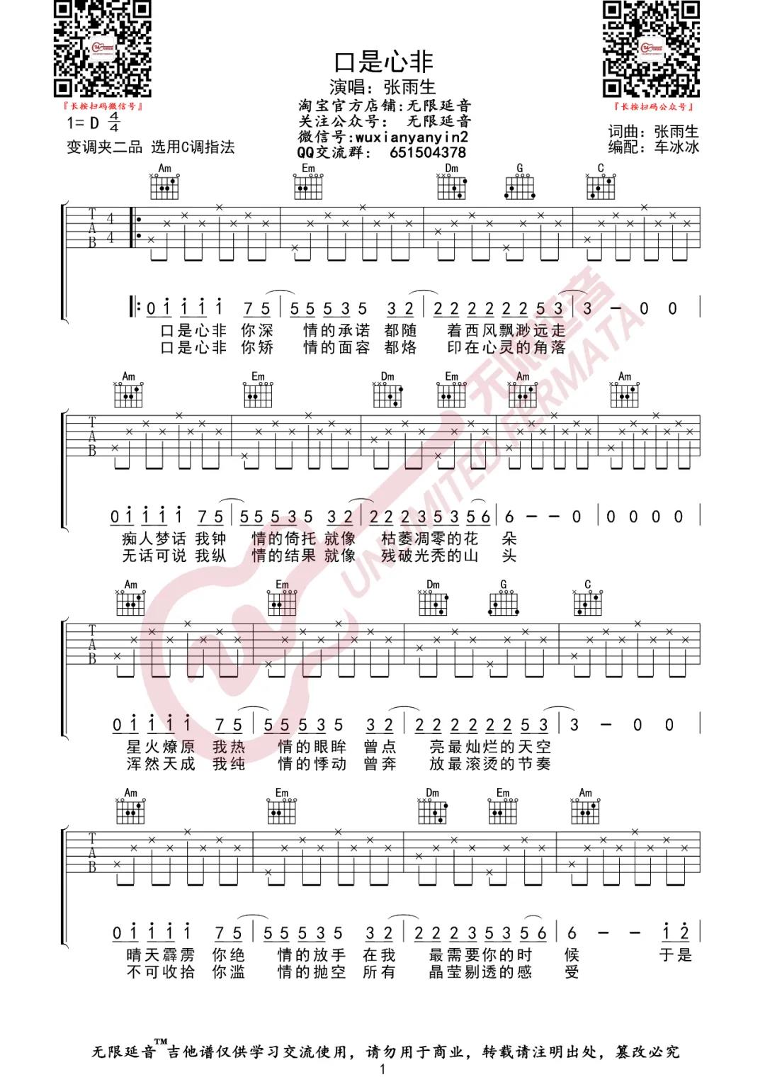 口是心非吉他谱 - 张雨生 - D调吉他弹唱谱