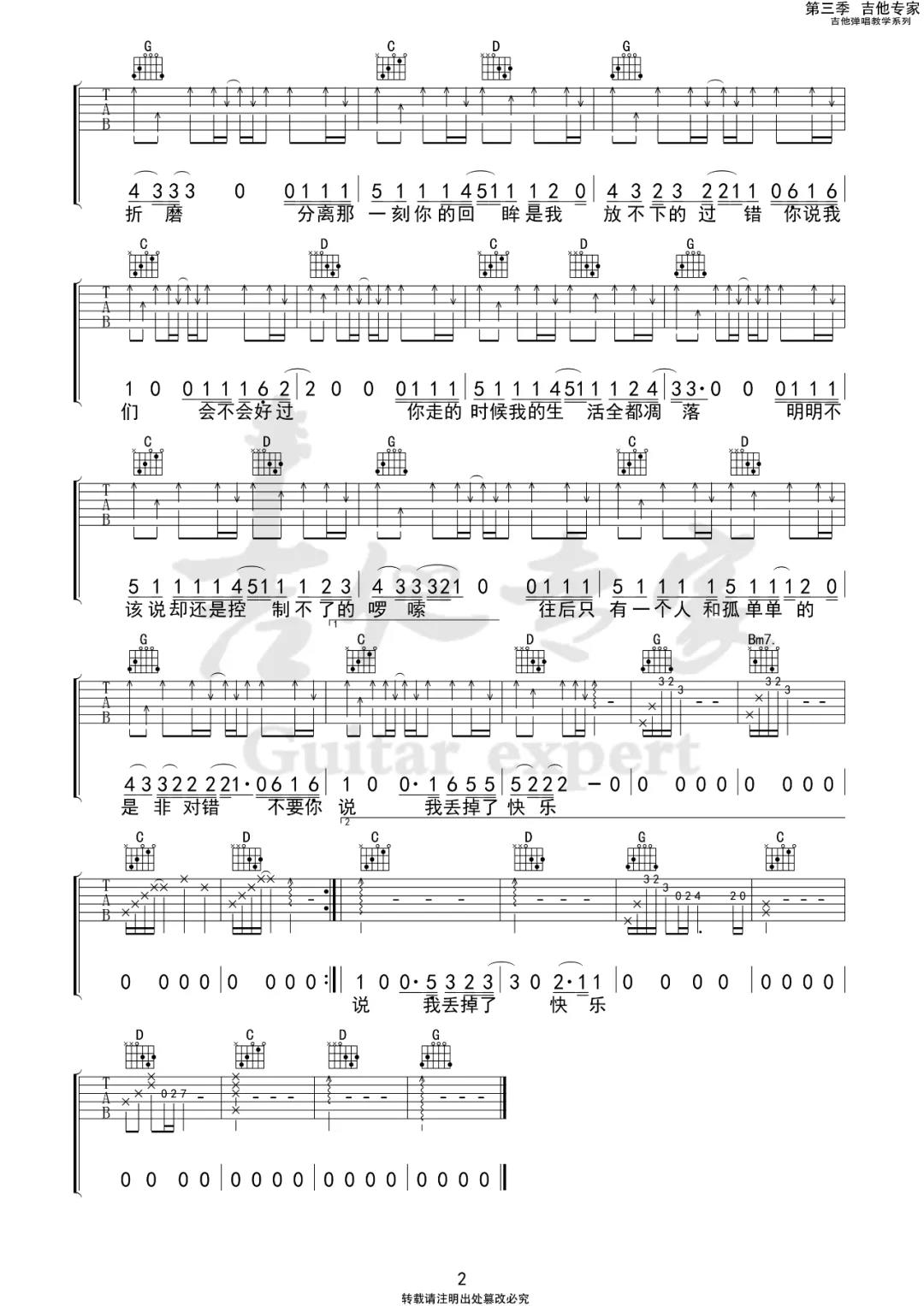 曲谱介绍: 隔壁老樊《失乐》吉他弹唱谱,采用G调指法编配,共有2张高清图谱,免翻页排版设计。