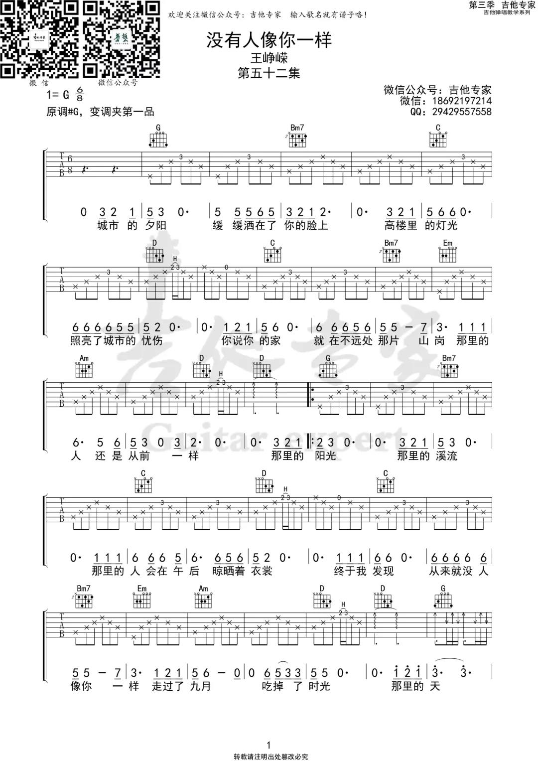 曲谱介绍: 王峥嵘《没有人像你一样》吉他弹唱谱,采用G调指法编配,共有3张高清图谱。