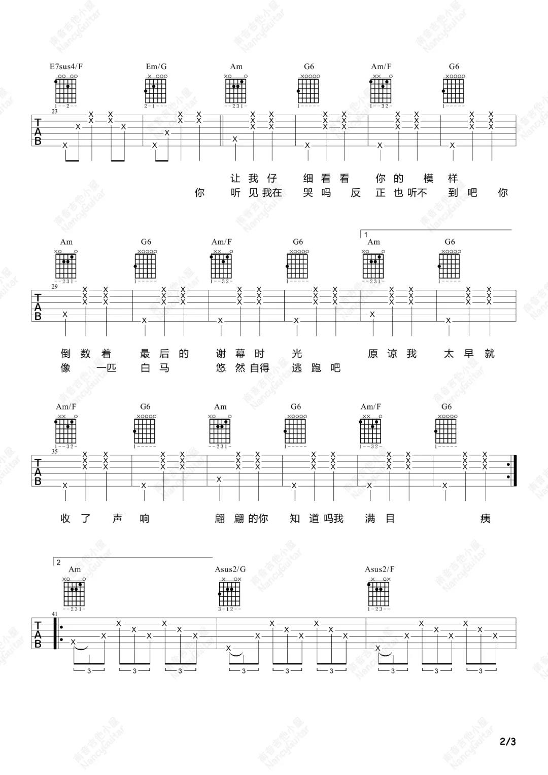 曲谱介绍: 福禄寿《马》吉他弹唱谱,采用A调指法编配,共有3张高清图谱。