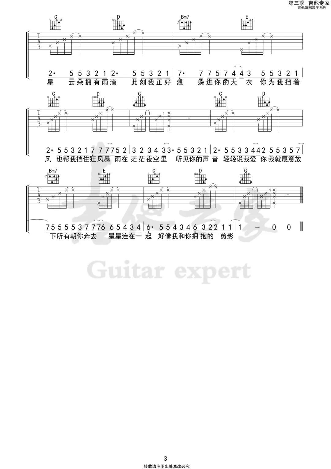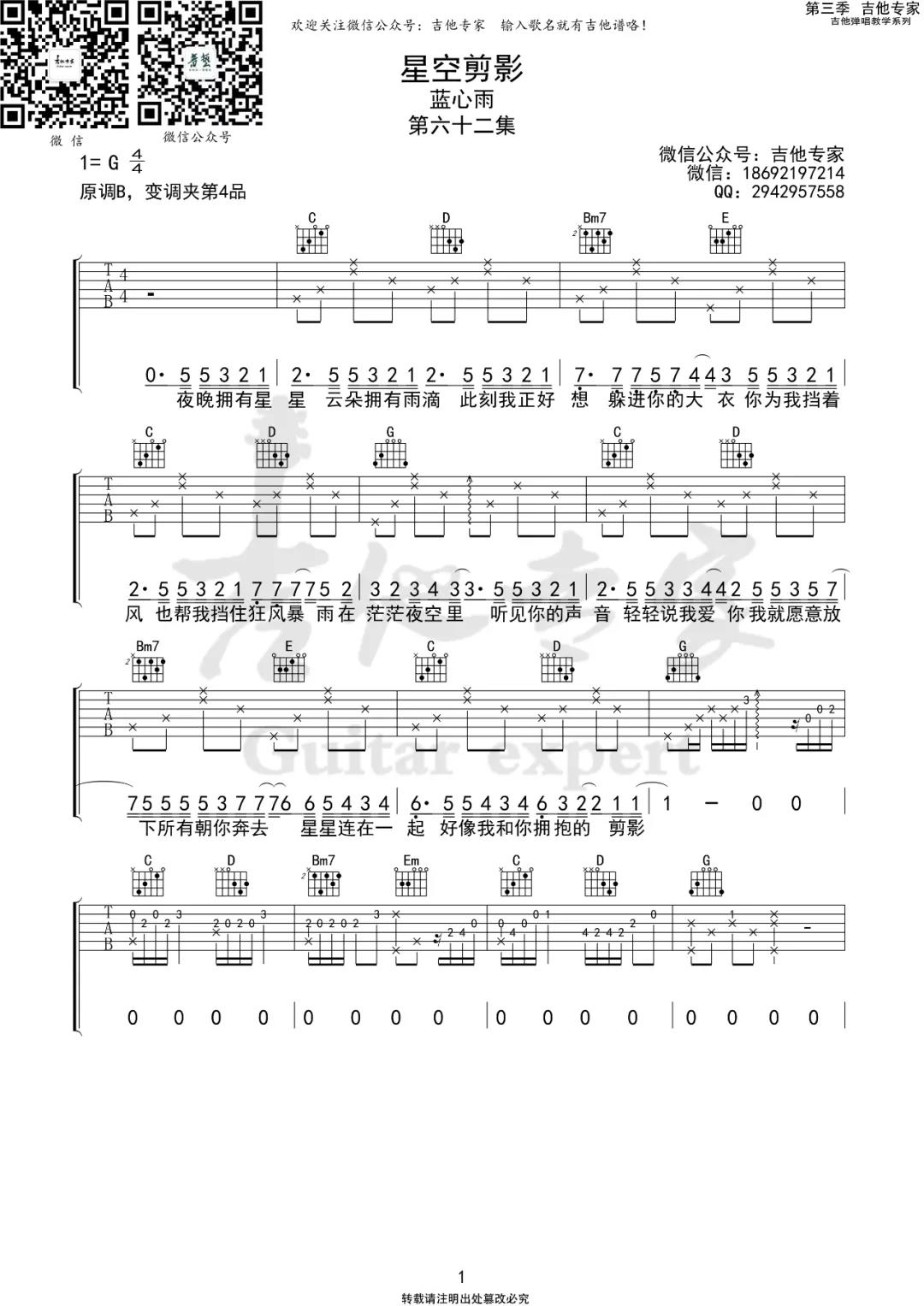 曲谱介绍: 蓝心雨《星空剪影》吉他弹唱谱,采用G调指法编配,共有3张高清图谱。