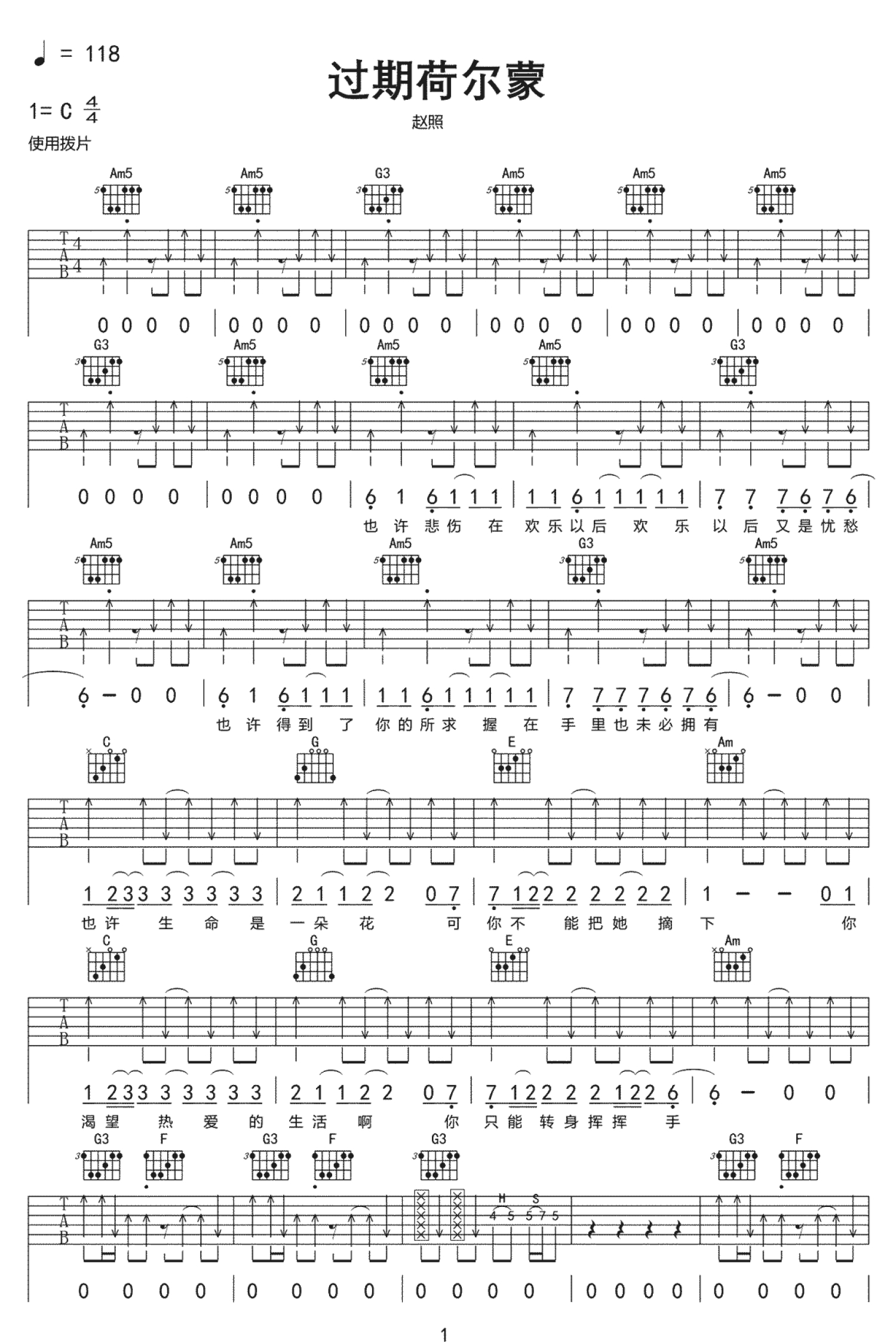 曲谱介绍: 赵照《过期荷尔蒙》吉他谱_C调吉他弹唱谱