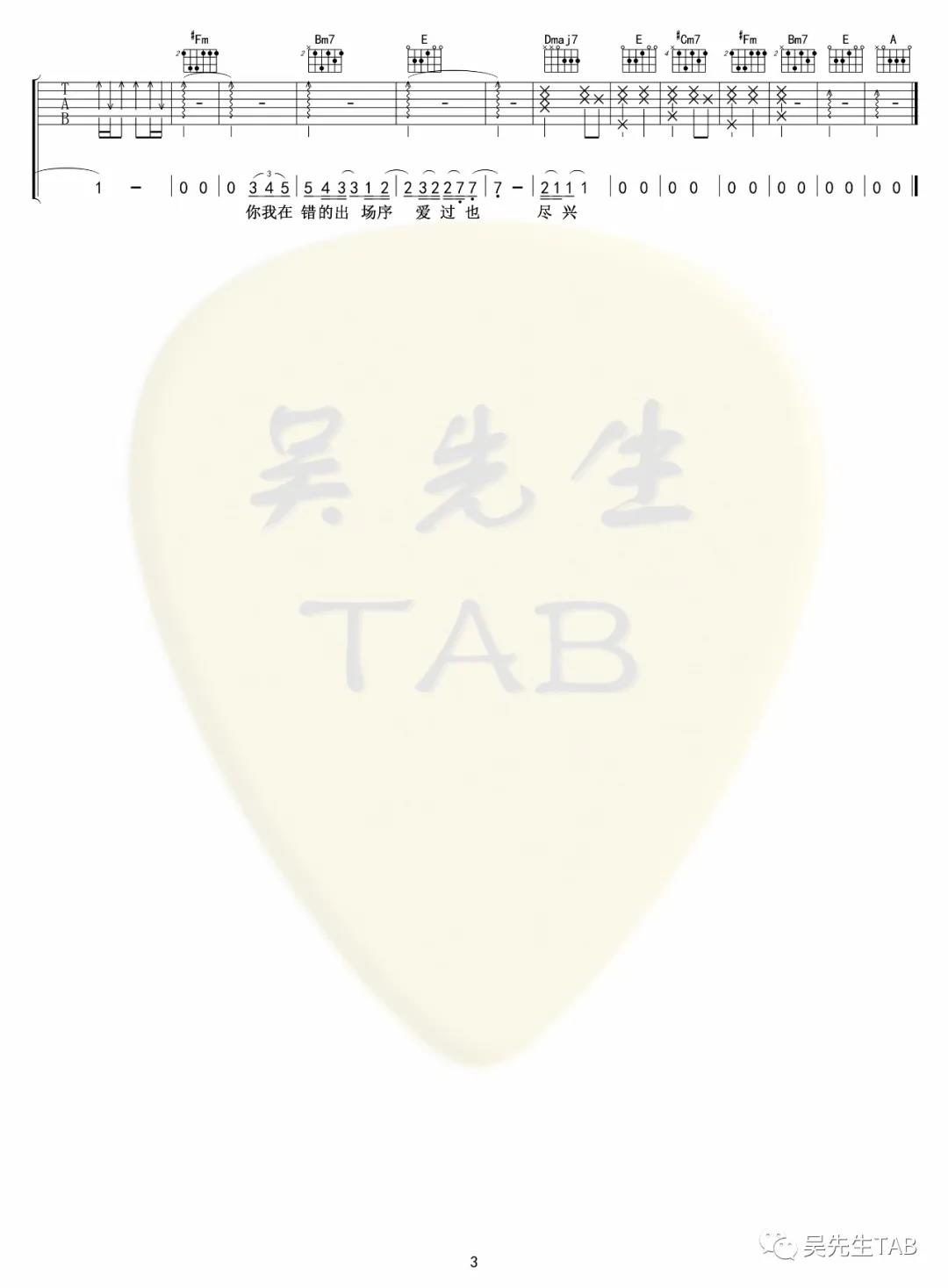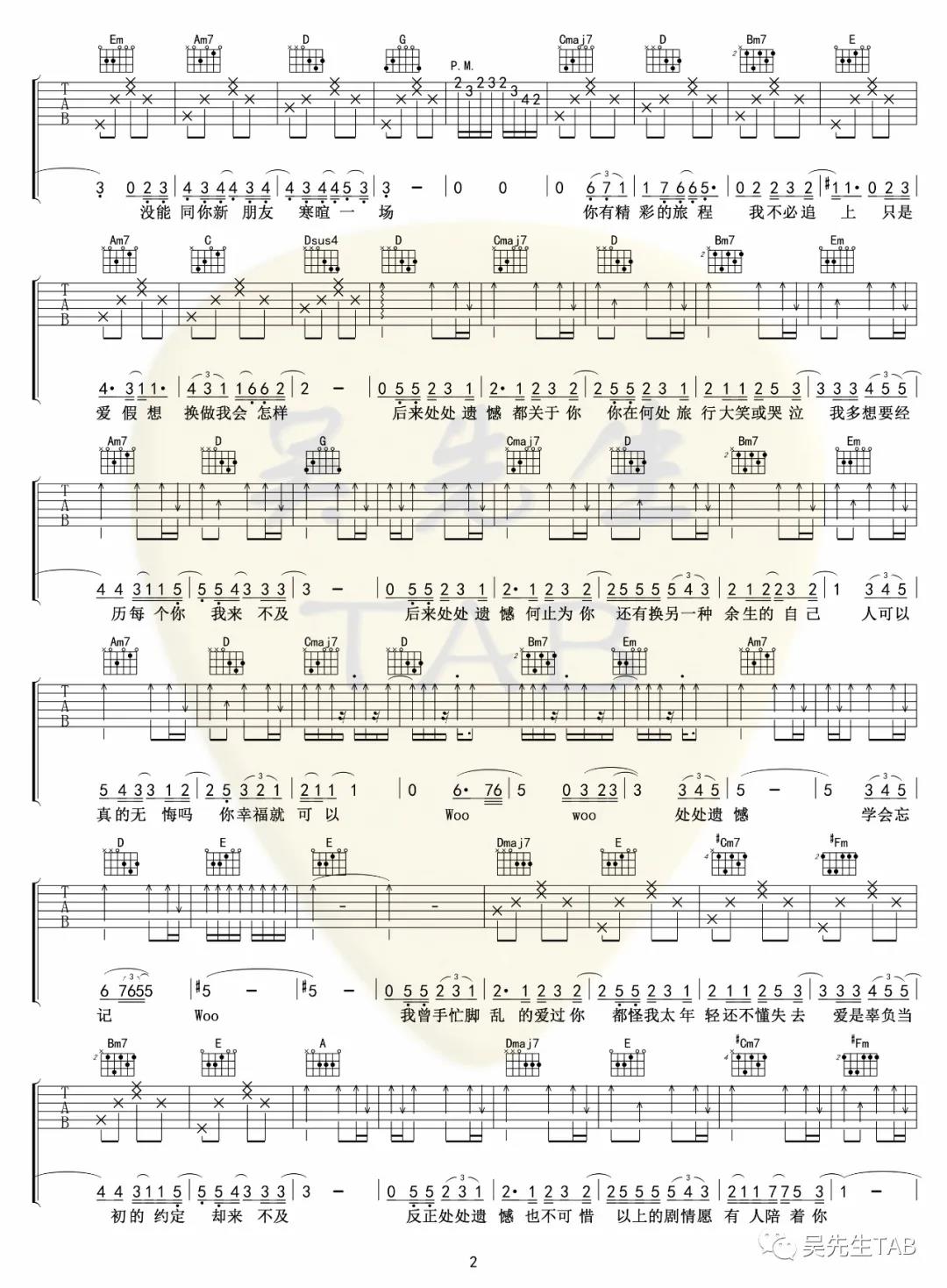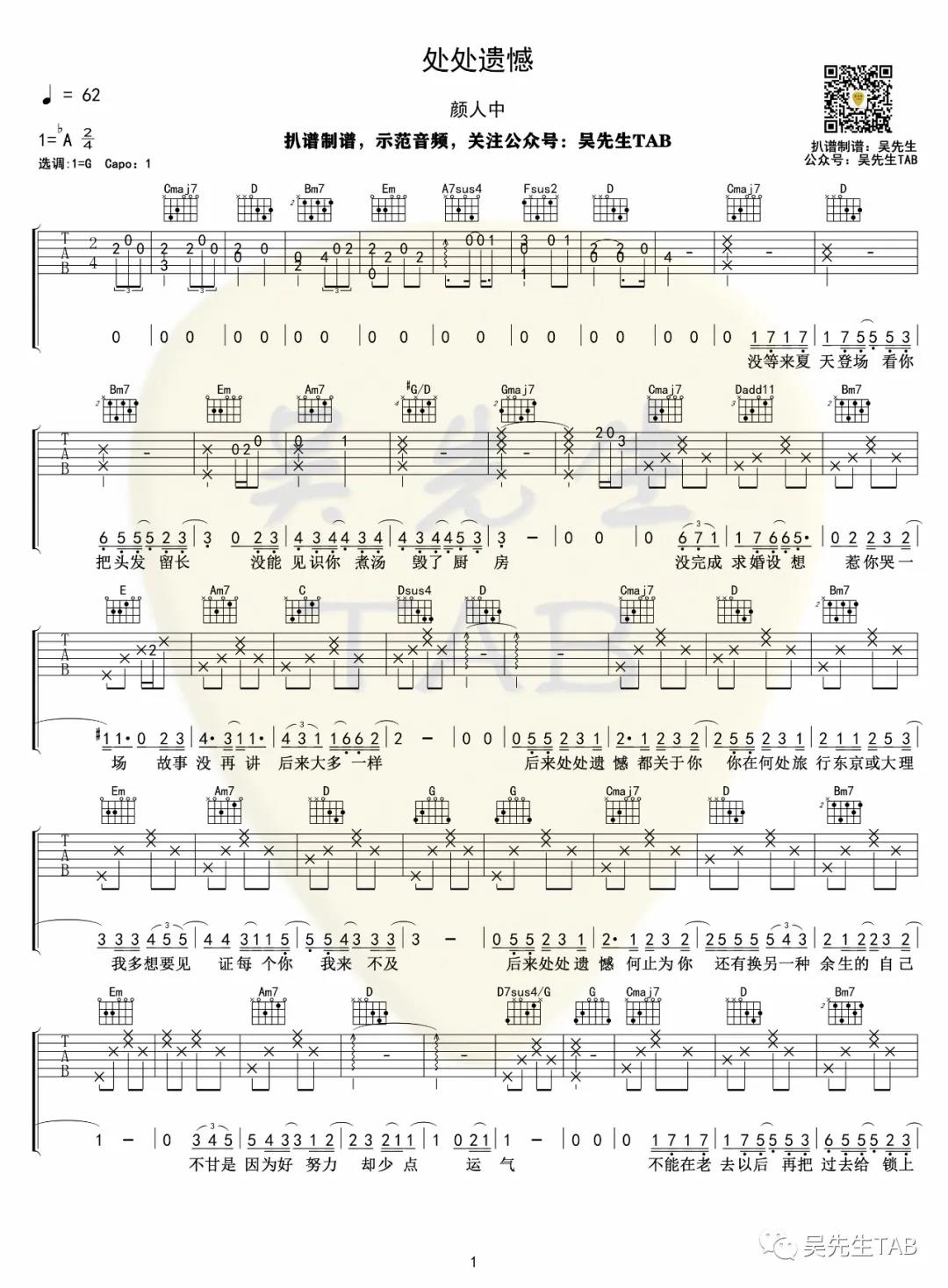 曲谱介绍: 颜人中《处处遗憾》吉他弹唱谱,采用G调指法编配,共有3张高清图谱。