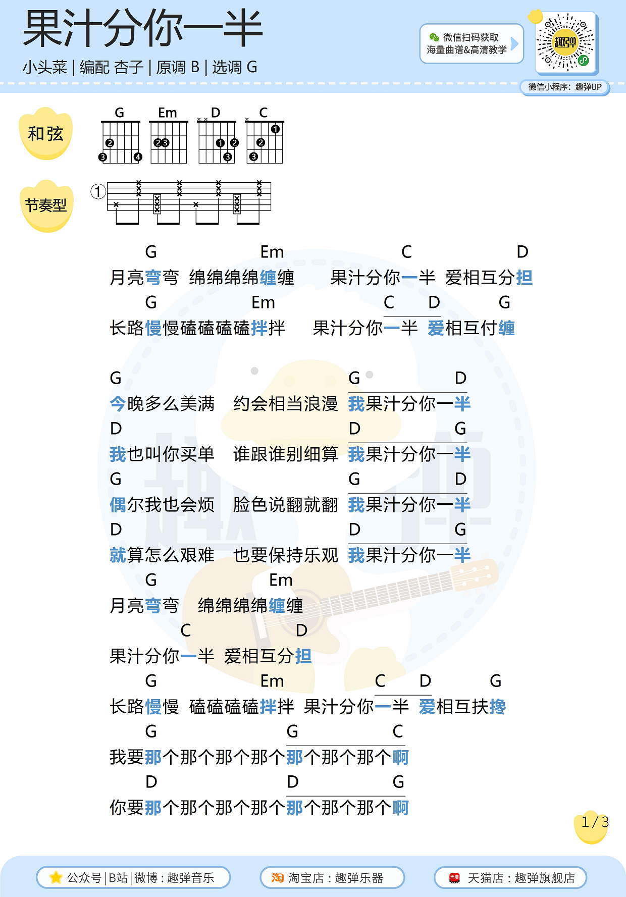 曲谱介绍: 小头菜《我的果汁分你一半》吉他弹唱谱,采用G调指法编配,共有3张高清图谱。