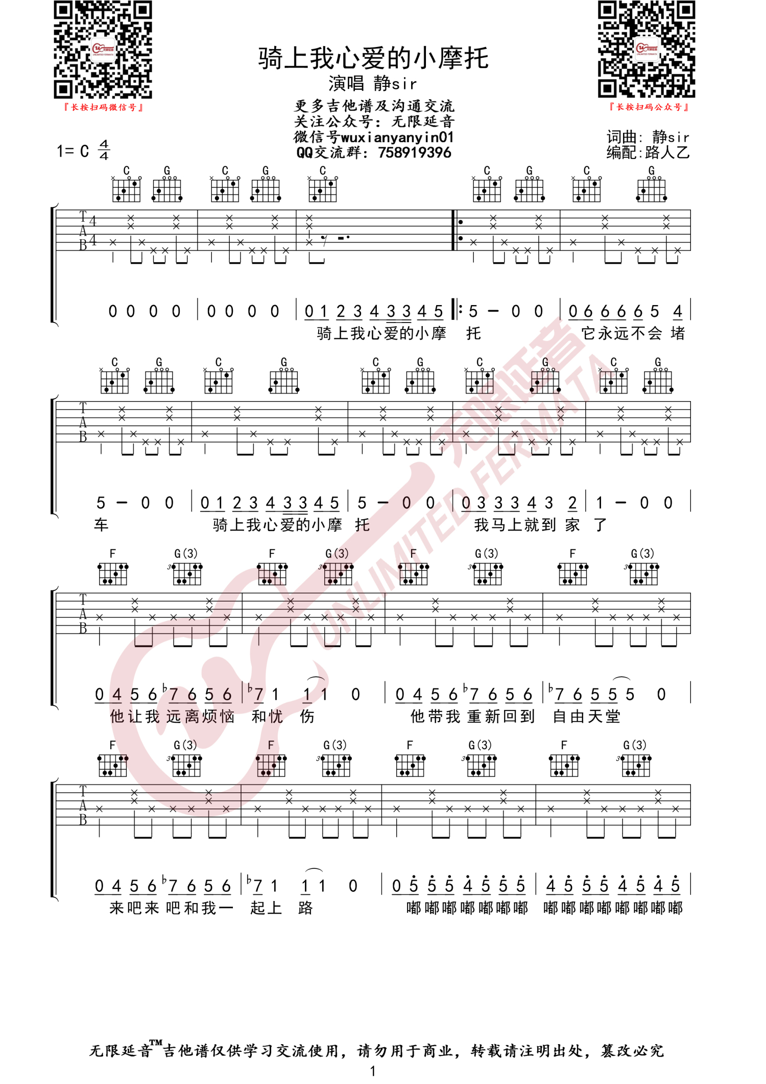 曲谱介绍: 静sir《骑上我心爱的小摩托》吉他谱_C调吉他弹唱谱