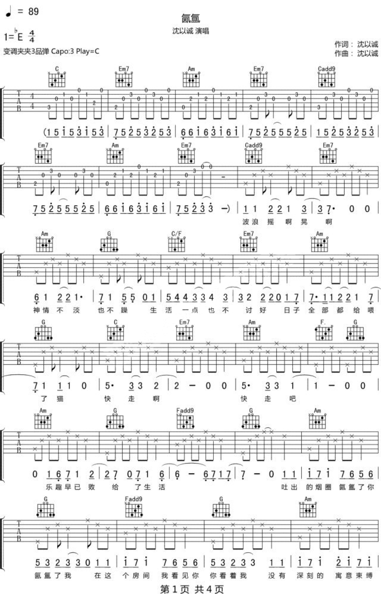 氤氲吉他谱 - 沈以诚 - C调吉他弹唱谱