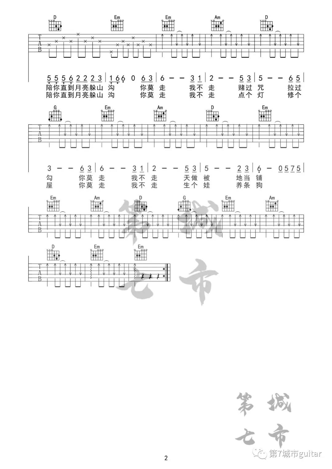曲谱介绍: 山水组合《你莫走》吉他弹唱谱,采用G调指法编配,共有2张高清图谱,免翻页排版设计。