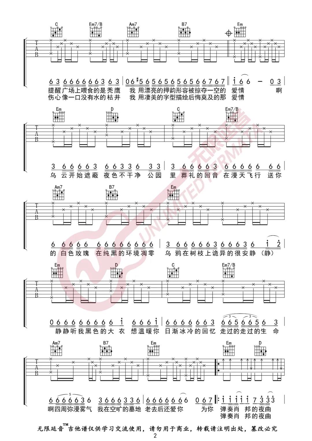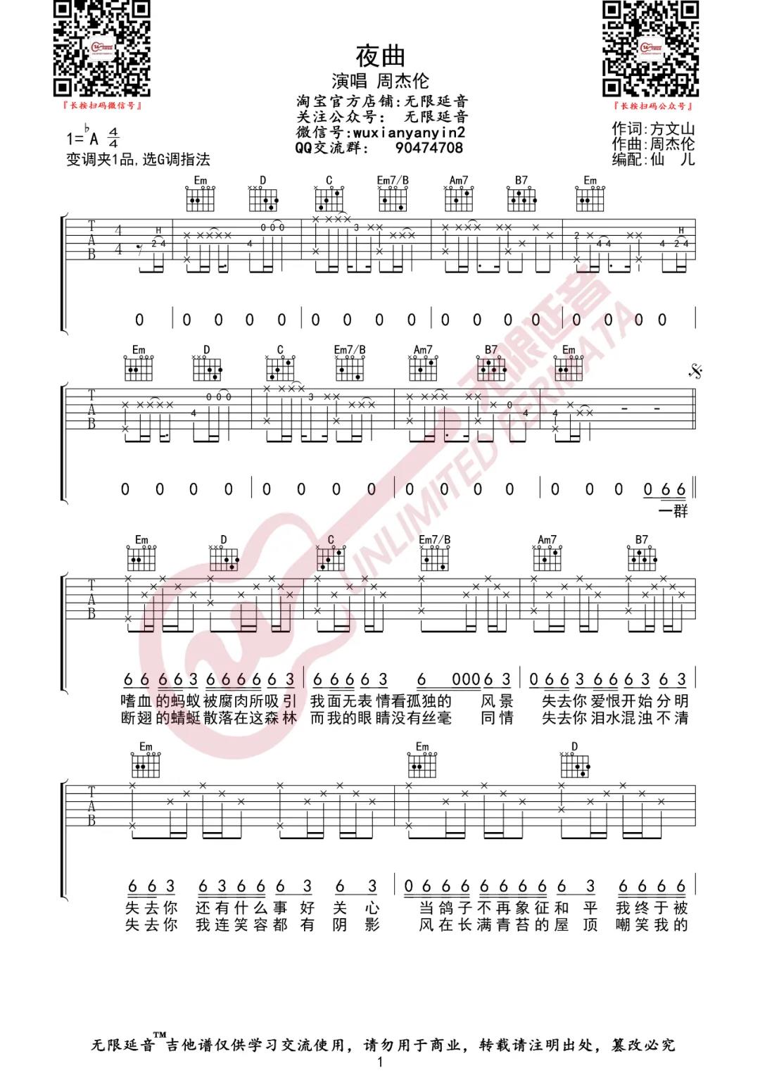 曲谱介绍: 周杰伦《夜曲》吉他弹唱谱,采用G调指法编配,共有3张高清图谱。