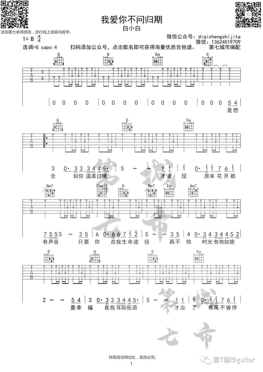 曲谱介绍: 白小白《我爱你不问归期》吉他弹唱谱,采用G调指法编配,共有3张高清图谱。