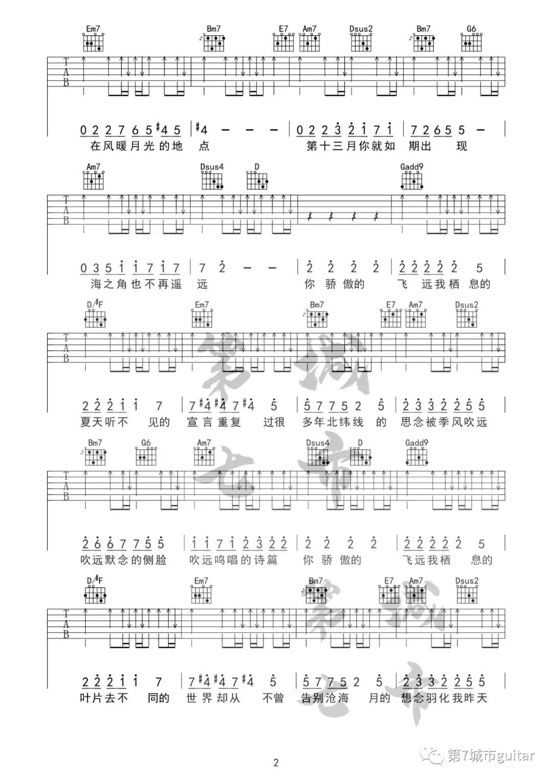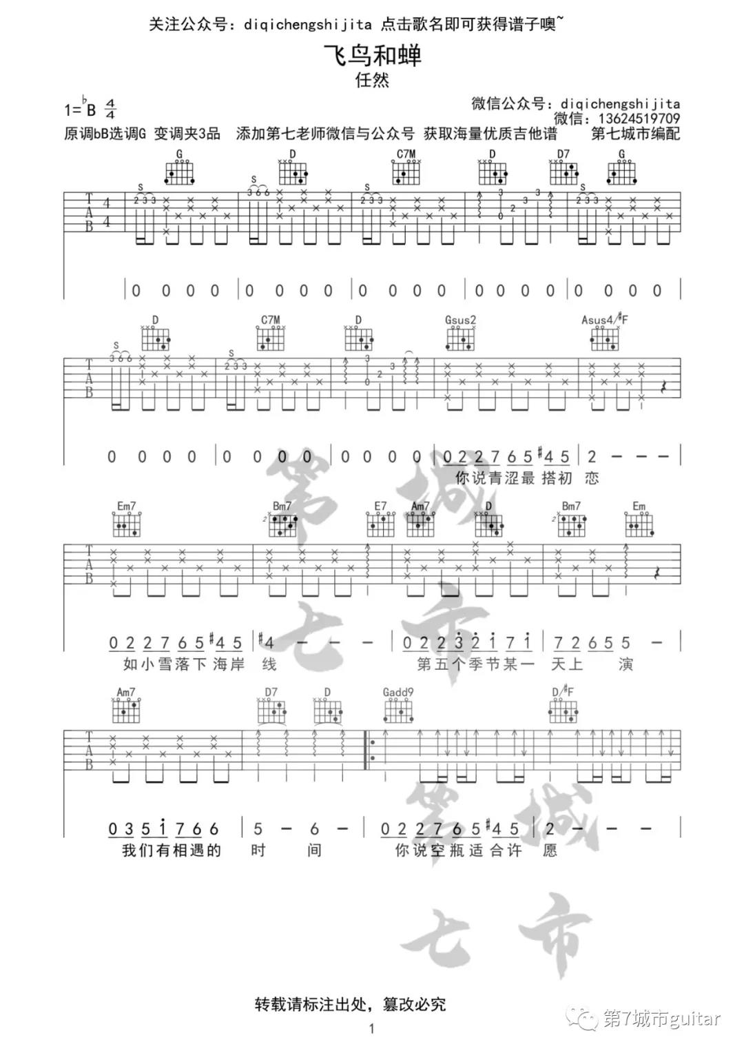 曲谱介绍: 任然《飞鸟和蝉》吉他弹唱谱,采用G调指法编配,共有3张高清图谱。