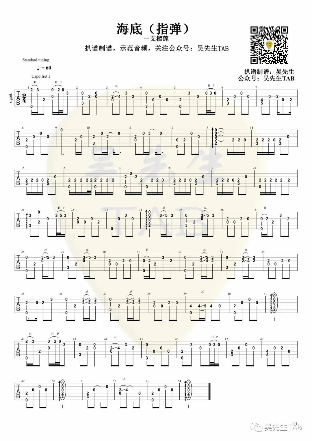 曲谱介绍: 一只榴莲《海底()》吉他独奏谱,采用C调指法编配,共有1张高清图谱,免翻页排版设计。