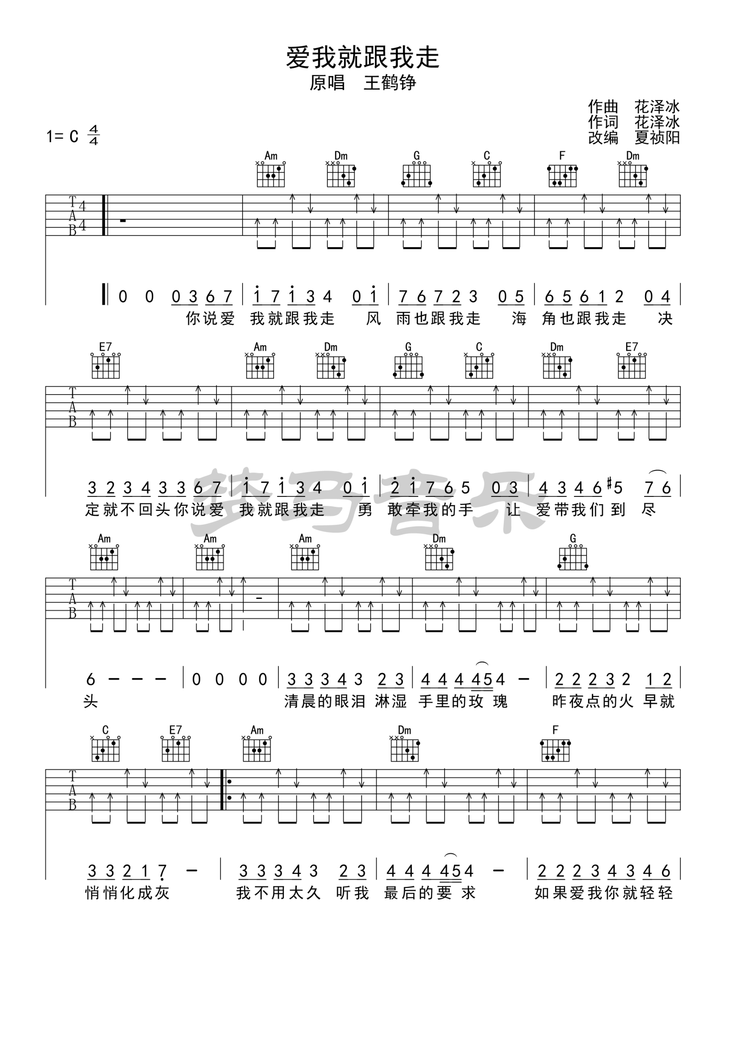 曲谱介绍: 王鹤铮《爱我就跟我走》吉他谱_C调吉他弹唱谱