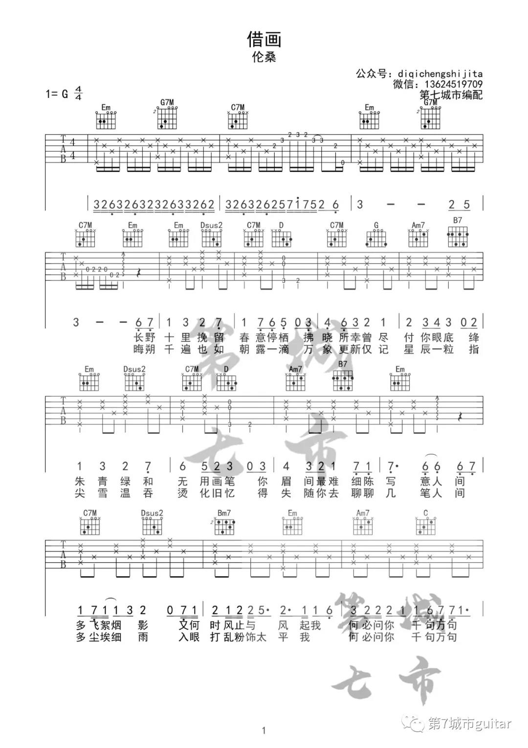 曲谱介绍: 伦桑《借画》吉他弹唱谱,采用G调指法编配,共有2张高清图谱,免翻页排版设计。