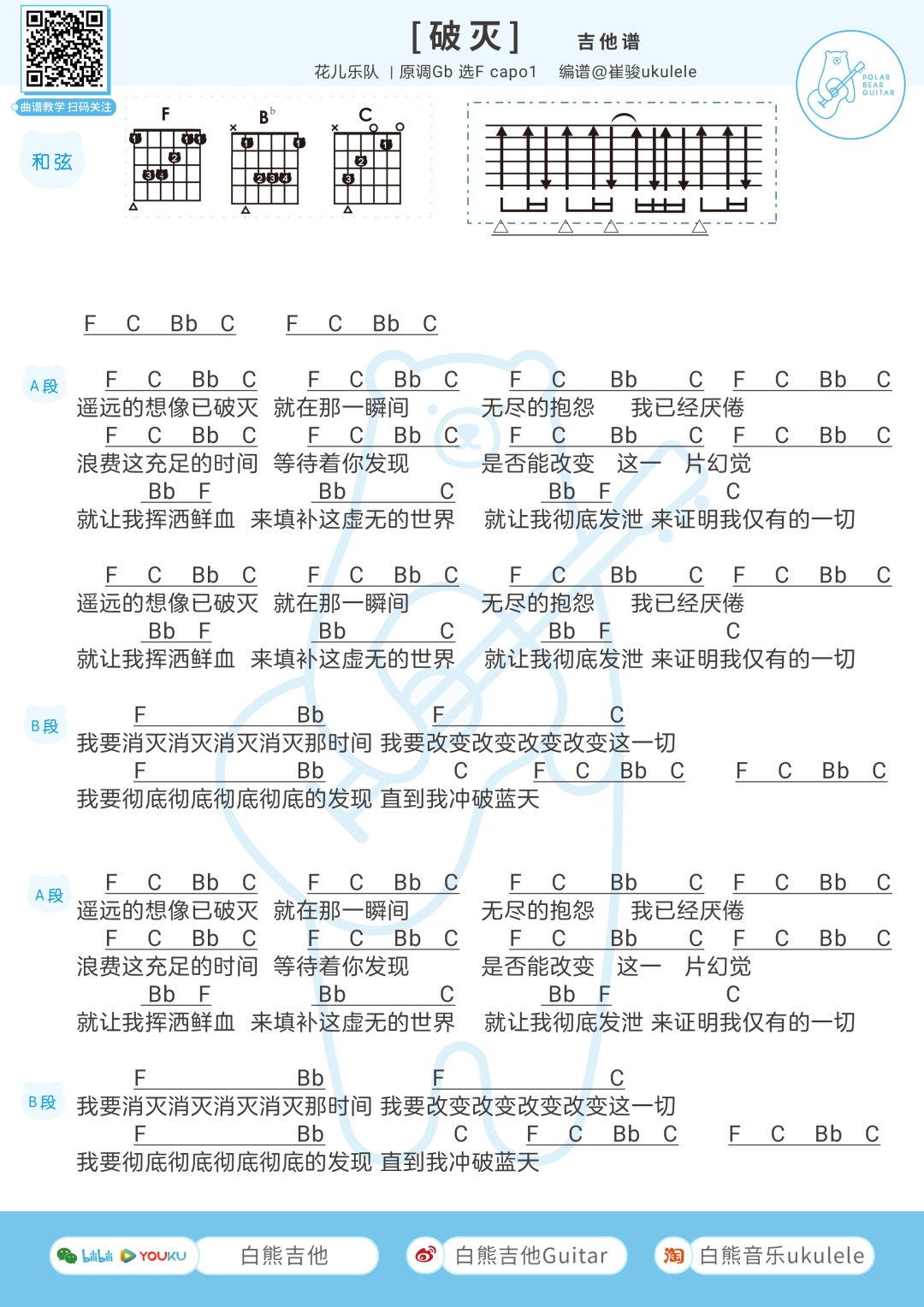 曲谱介绍: 花儿乐队《破灭》吉他弹唱谱,采用F调指法编配,共有1张高清图谱,免翻页排版设计。