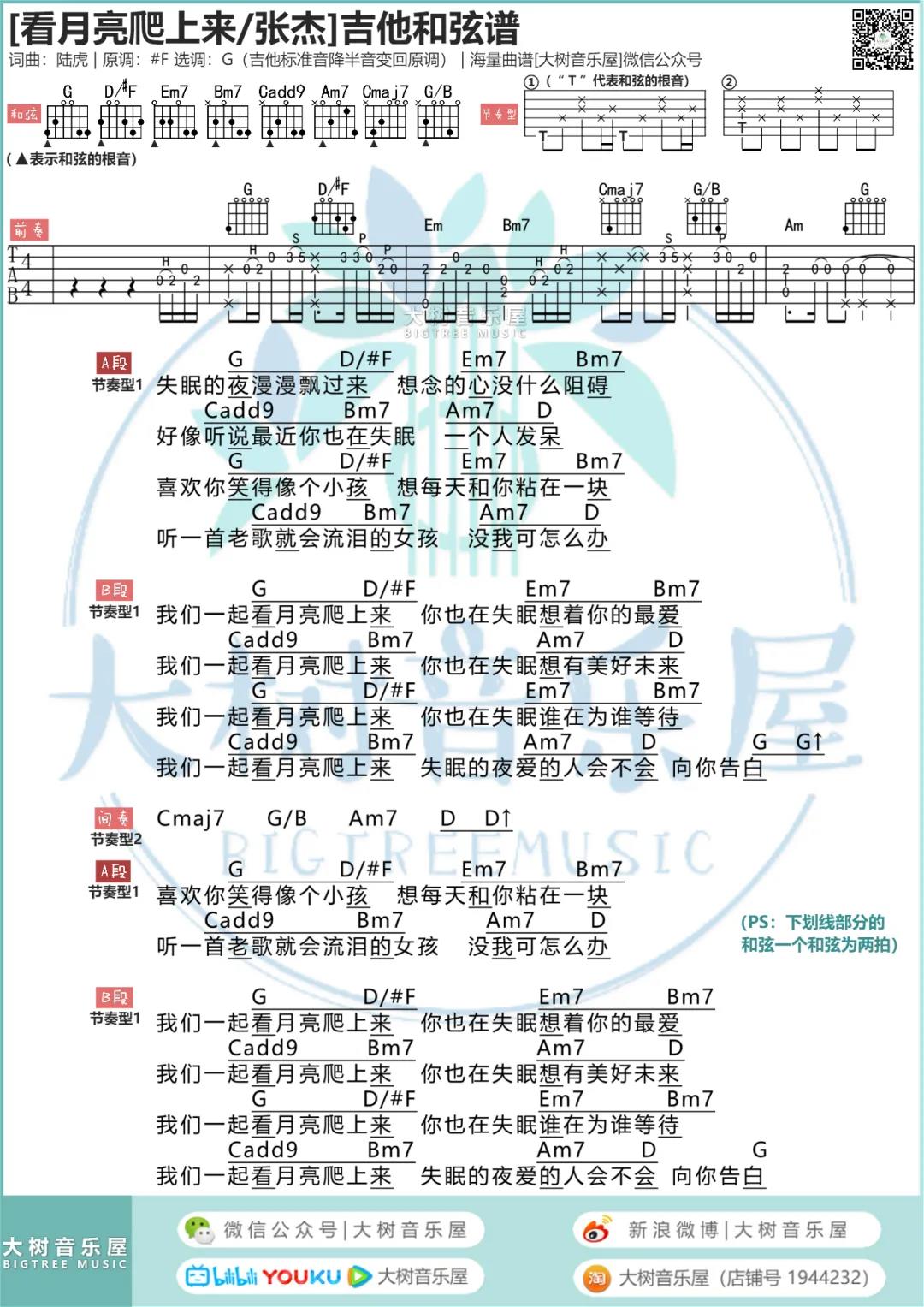曲谱介绍: 张杰《看月亮爬上来》吉他弹唱谱,采用G调指法编配,共有1张高清图谱,免翻页排版设计。