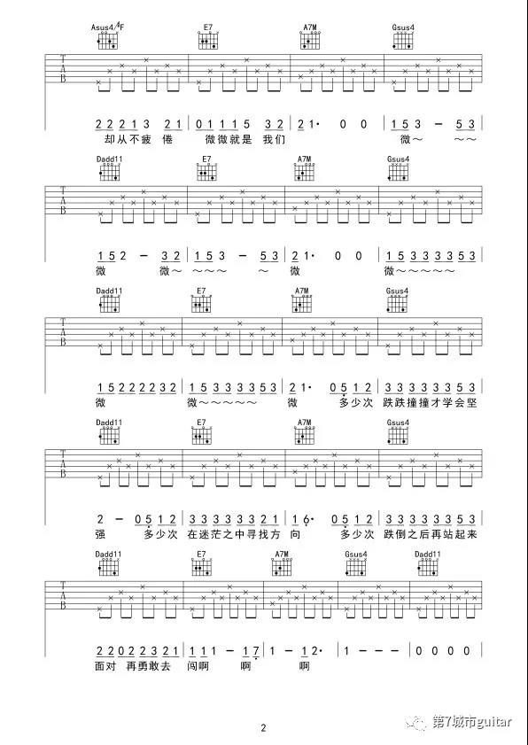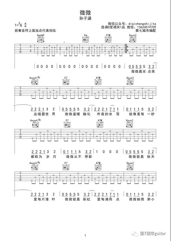 曲谱介绍: 孙子涵《微微》吉他弹唱谱,采用G调指法编配,共有3张高清图谱。
