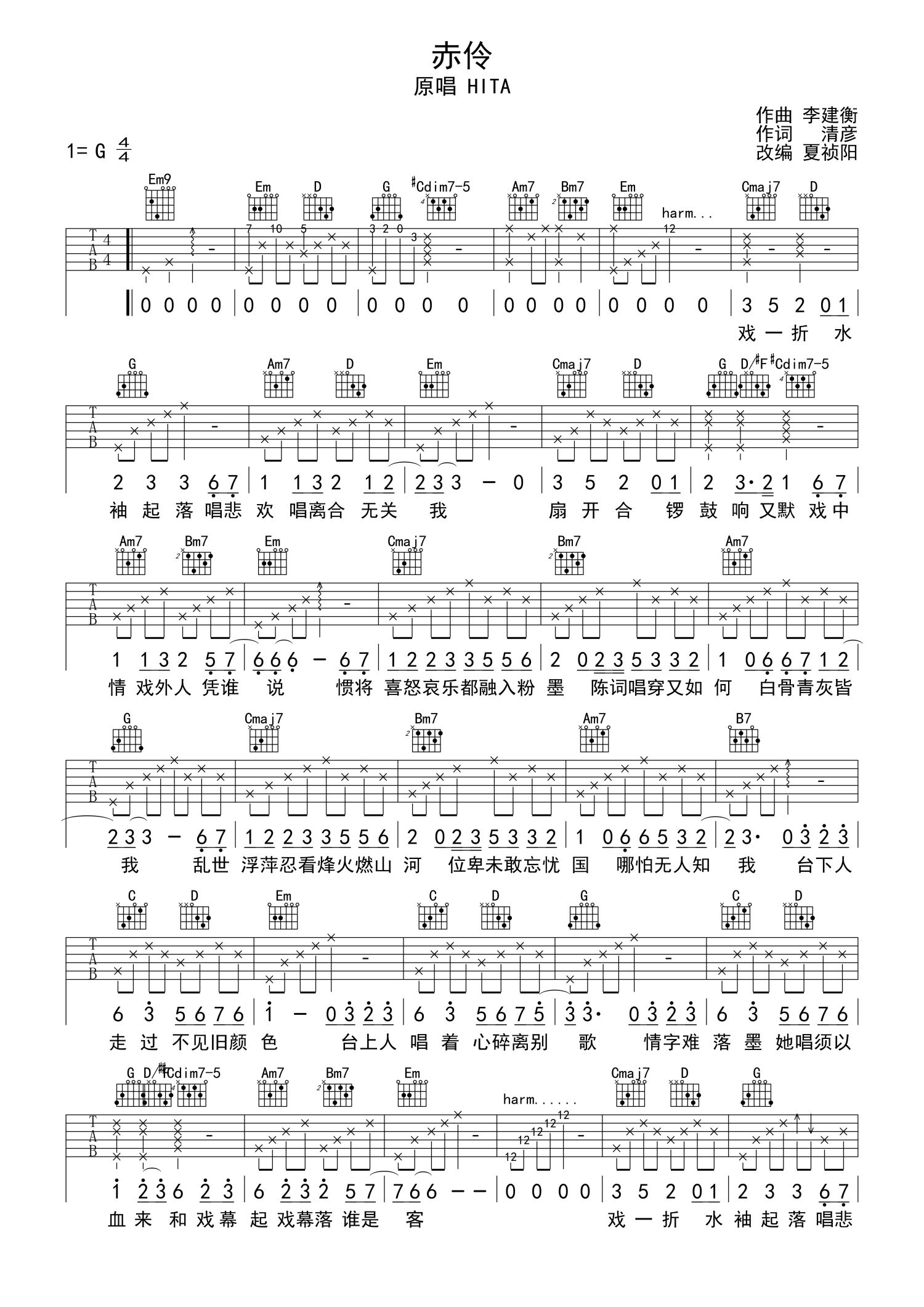 曲谱介绍: HIta《赤伶》吉他谱_G调吉他弹唱谱_执素兮版本