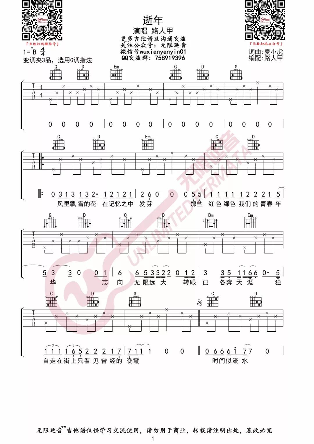 曲谱介绍: 路人甲《逝年》吉他弹唱谱,采用G调指法编配,共有2张高清图谱,免翻页排版设计。