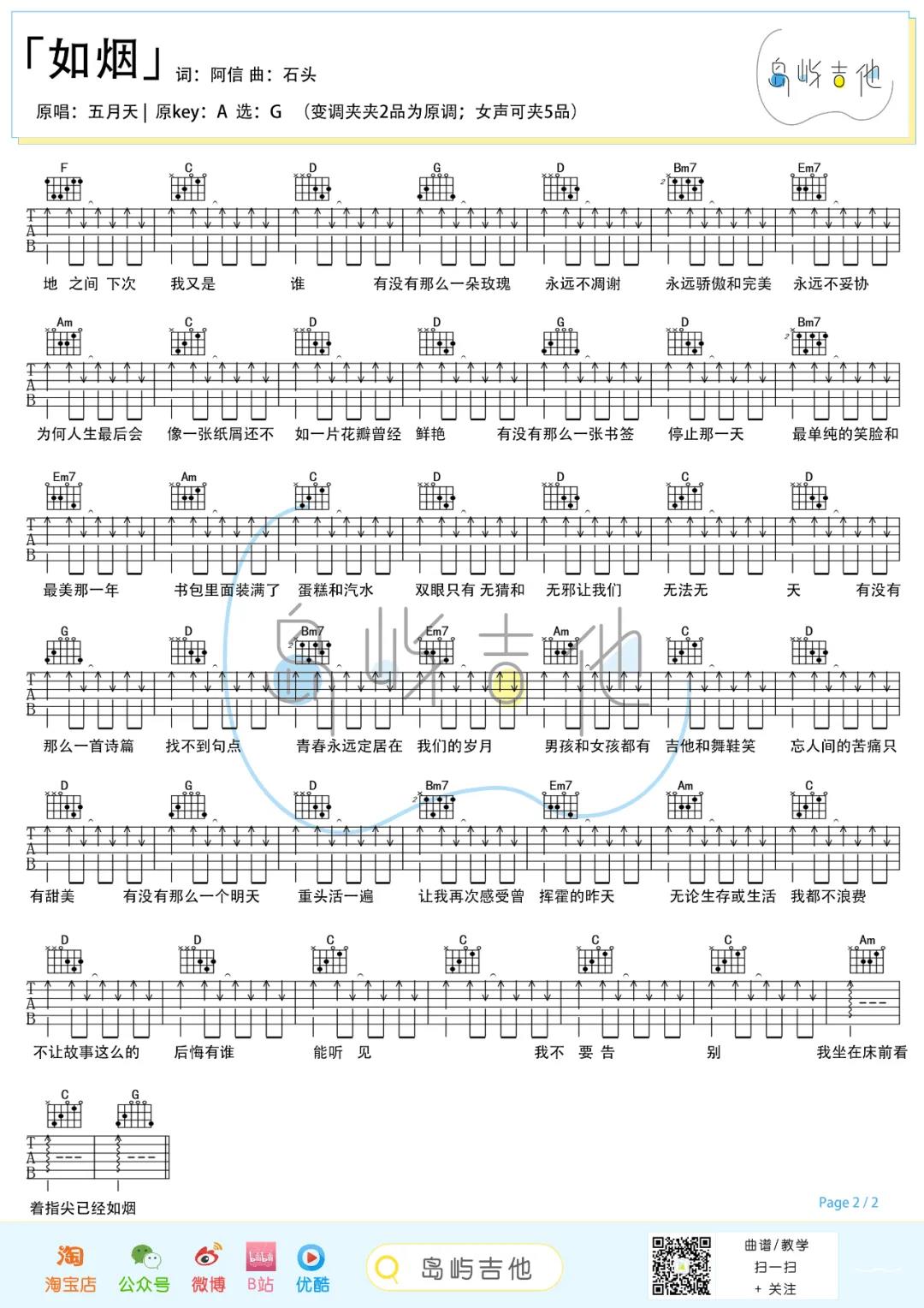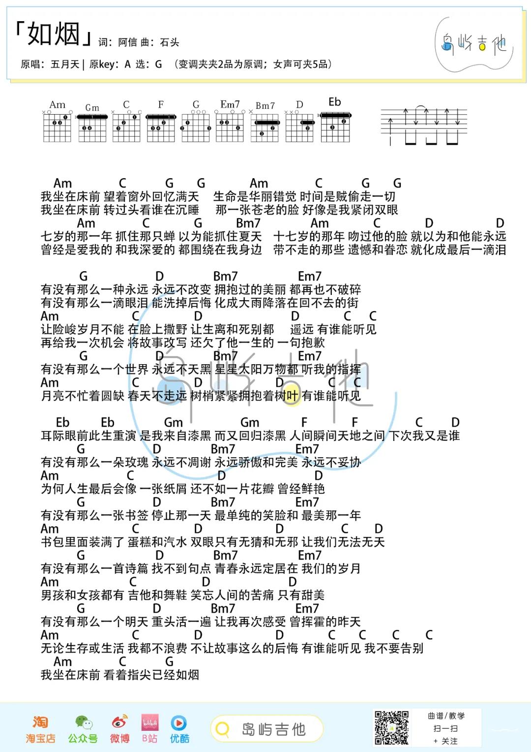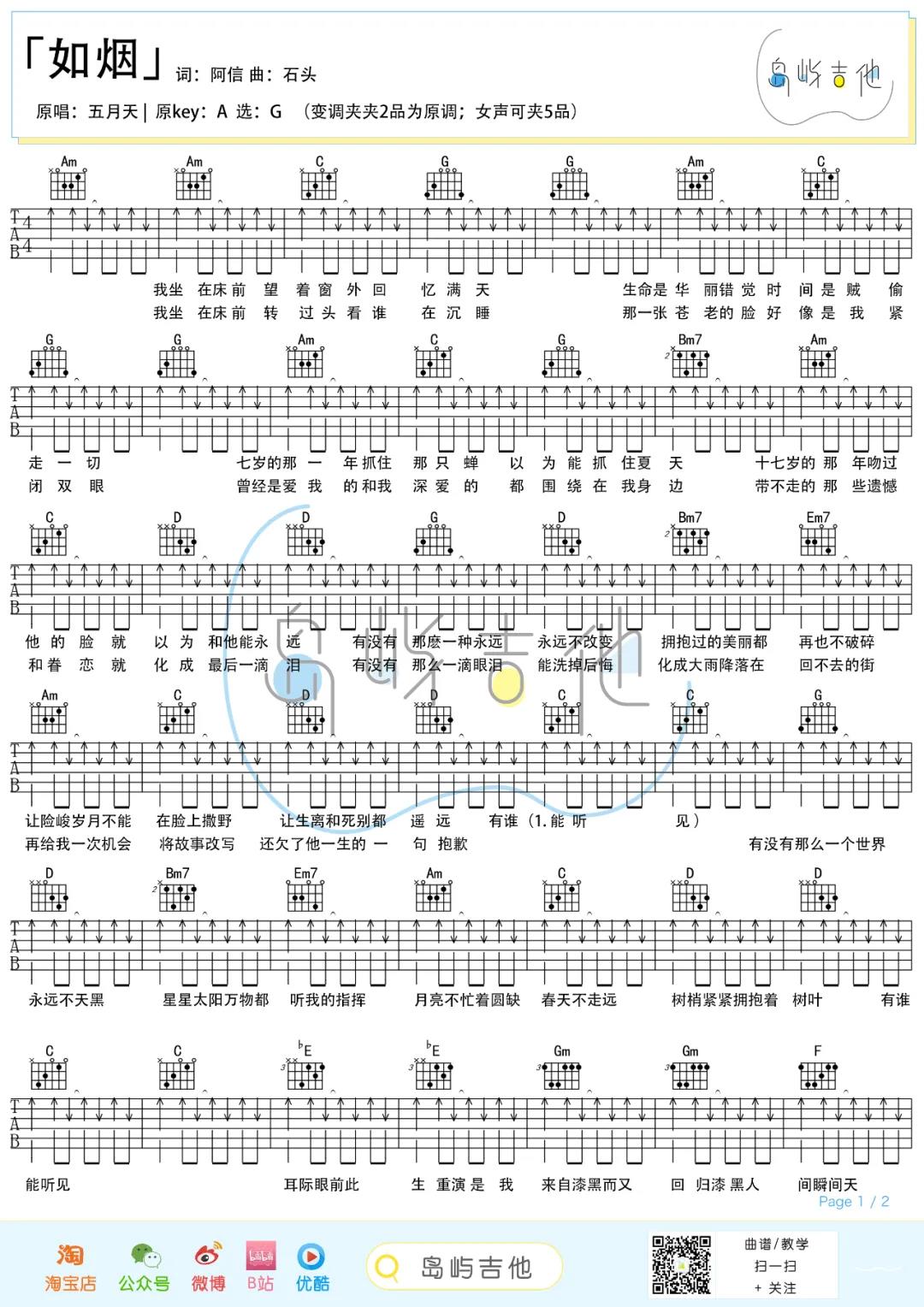 曲谱介绍: 五月天《如烟》吉他弹唱谱,采用G调指法编配,共有3张高清图谱。