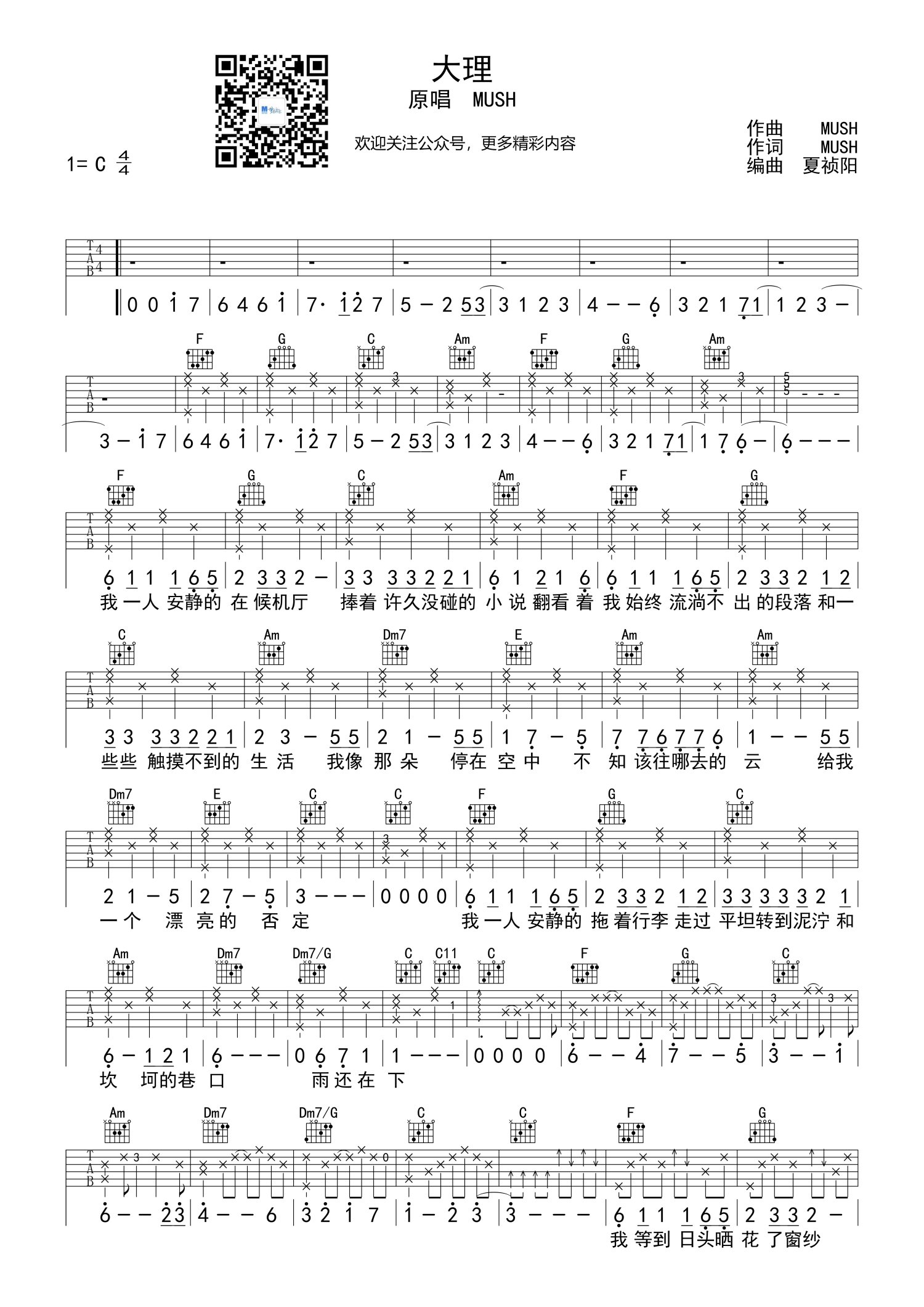 曲谱介绍: MUSH《大理》吉他谱_C调吉他弹唱谱