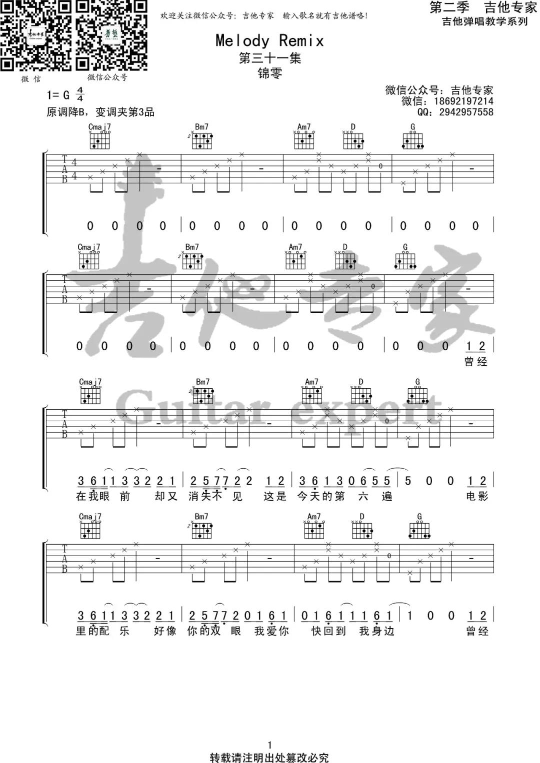 Melody Remix吉他谱 - 锦零 - G调吉他弹唱谱