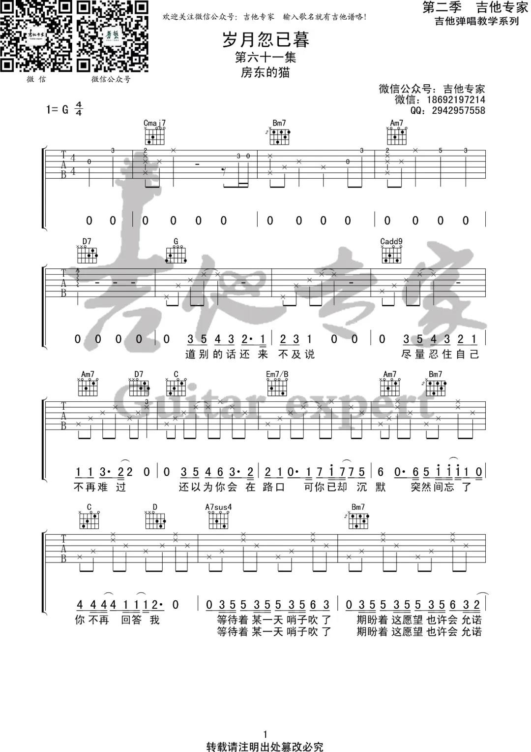 曲谱介绍: 房东的猫《岁月忽已暮》吉他弹唱谱,采用G调指法编配,共有2张高清图谱,免翻页排版设计。