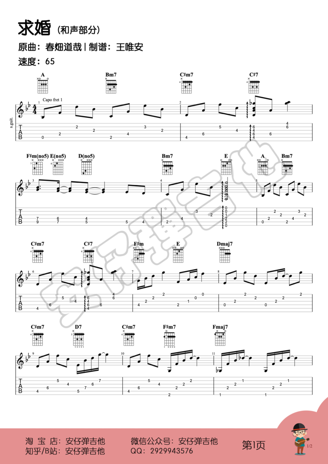 曲谱介绍: 春畑道哉《求婚()》吉他独奏谱,采用C调指法编配,共有3张高清图谱。