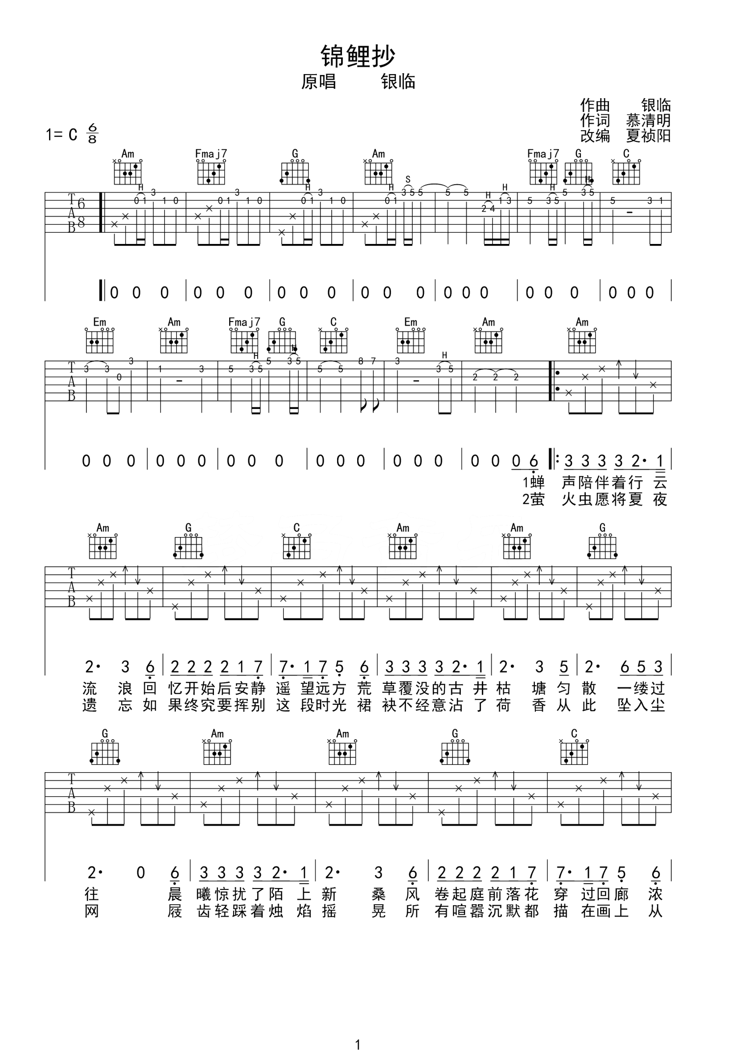 曲谱介绍: 银临《锦鲤抄》吉他谱_C调吉他弹唱谱