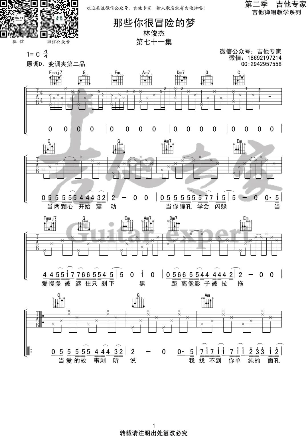 曲谱介绍: 林俊杰《那些你很冒险的梦》吉他弹唱谱,采用D调指法编配,共有3张高清图谱。