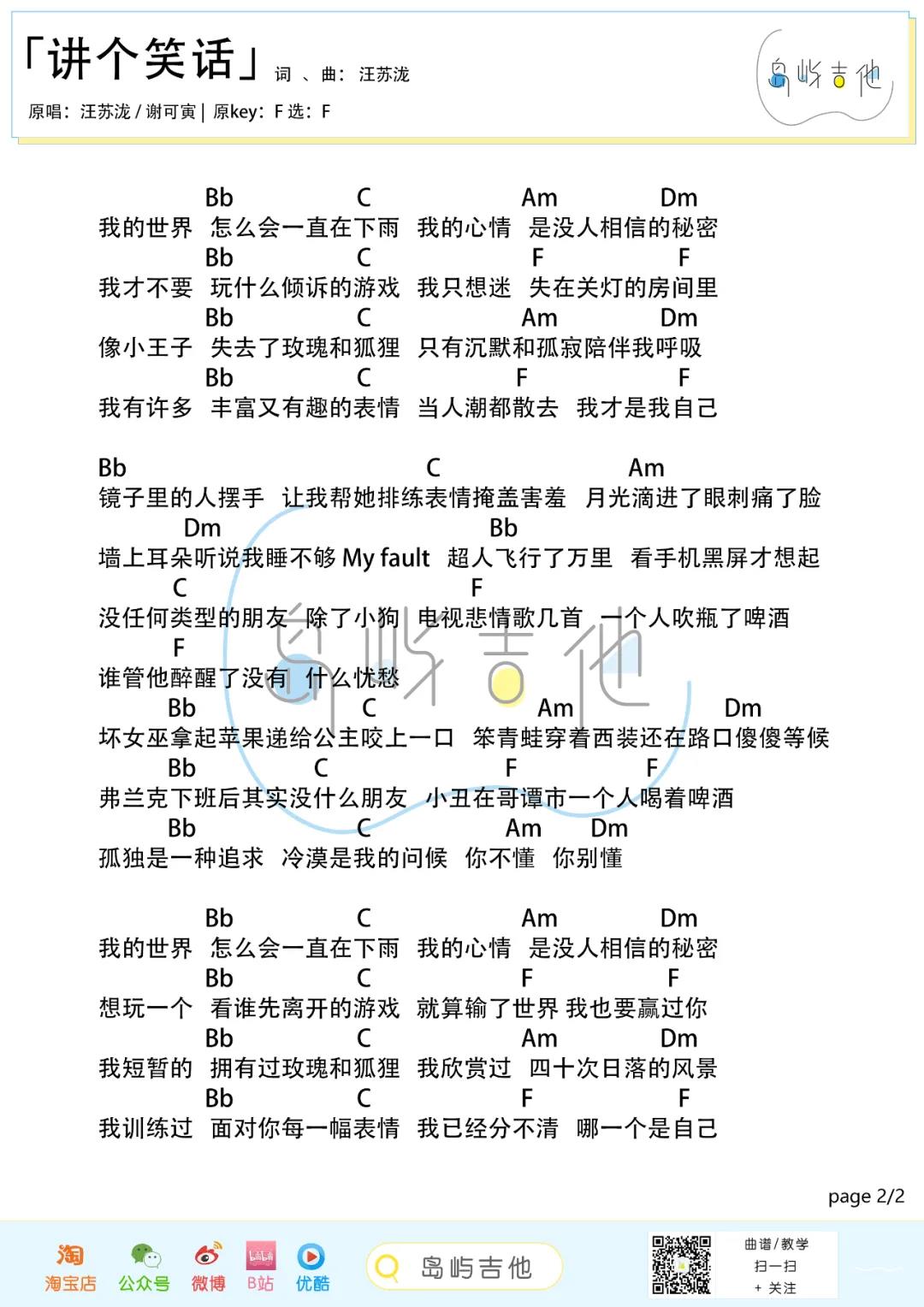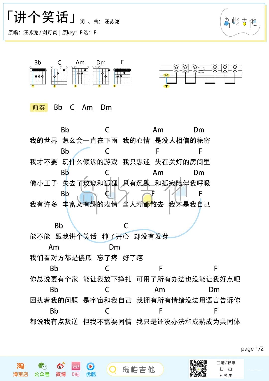 讲个笑话吉他谱 - 汪苏泷,谢可寅 - F调吉他弹唱谱