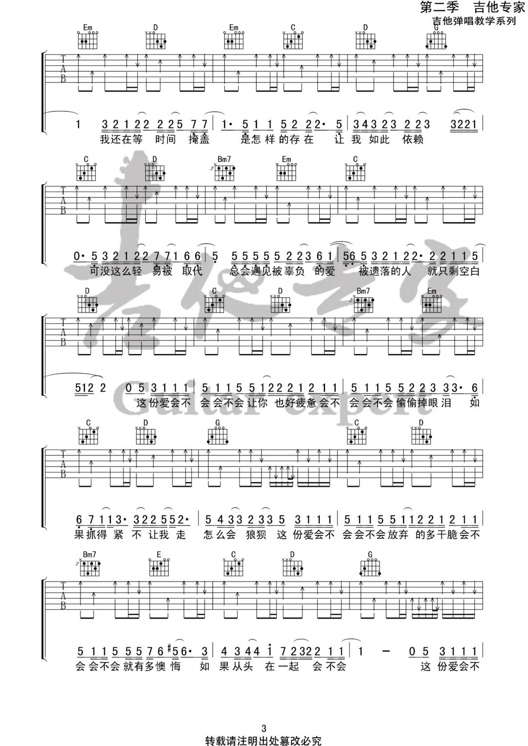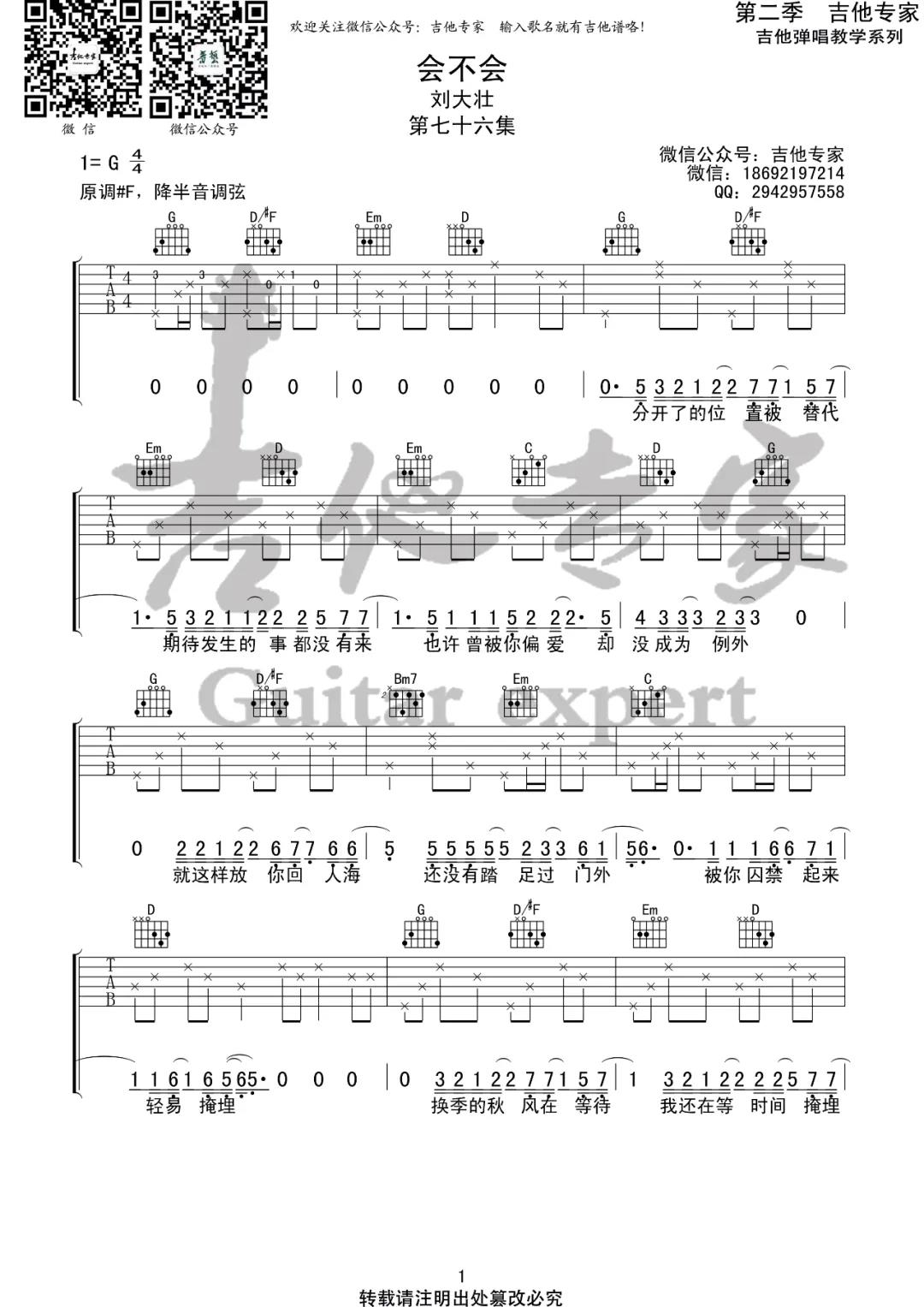 曲谱介绍: 刘大壮《会不会》吉他弹唱谱,采用G调指法编配,共有4张高清图谱。