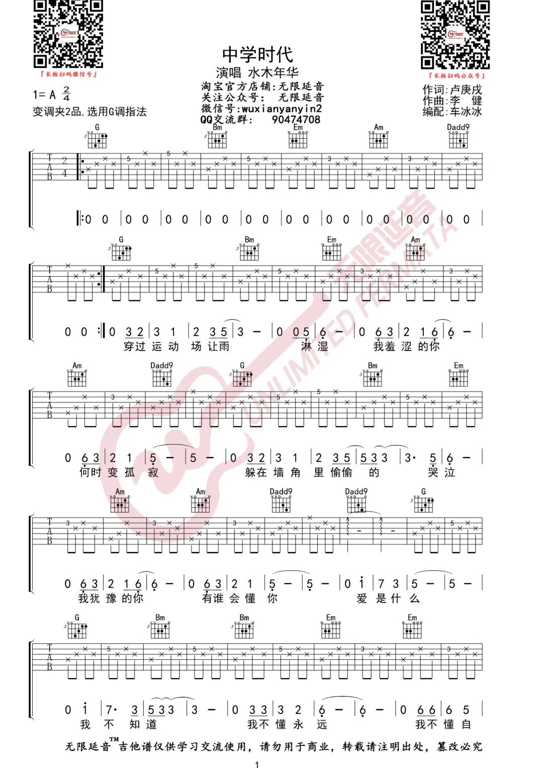 中学时代吉他谱 - 水木年华 - G调吉他弹唱谱