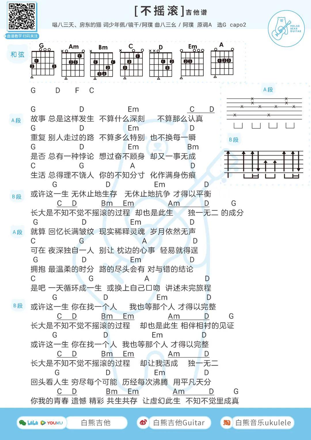 曲谱介绍: 〈不摇滚〉是由阿璞作曲,少年佩/镜千/阿璞共同作词的单曲,发行于2019年10月25日,这首歌也是八三夭和房东的猫首次的合作。