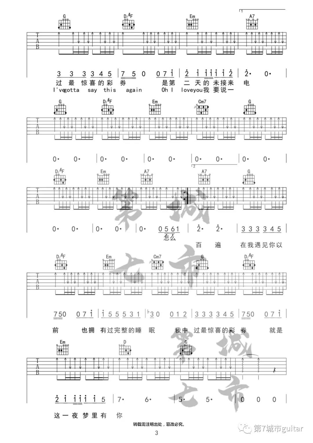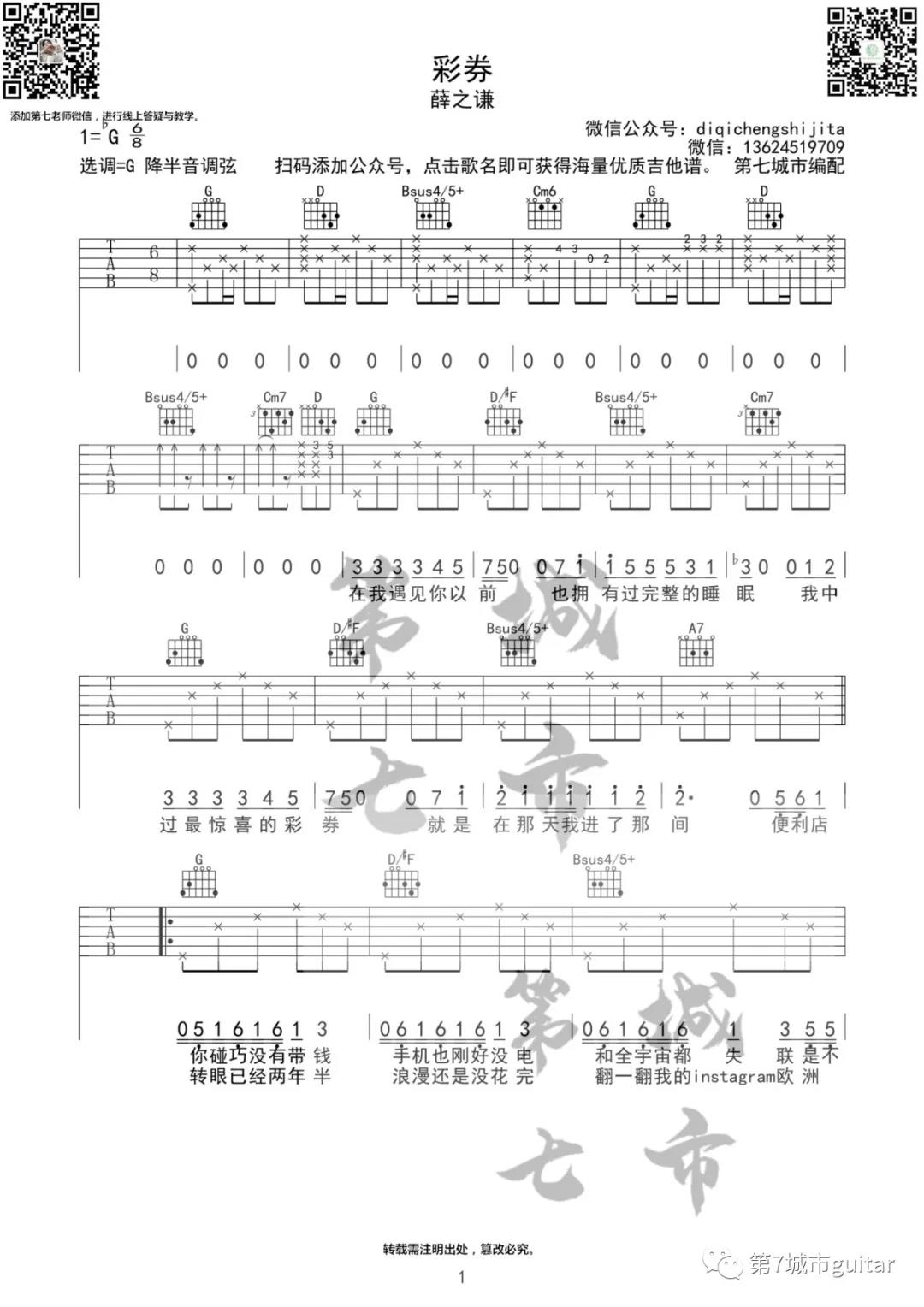 曲谱介绍: 薛之谦《彩券》吉他弹唱谱,采用G调指法编配,共有3张高清图谱。
