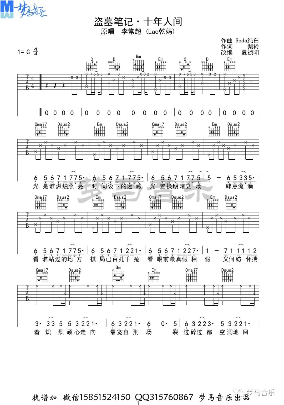 曲谱介绍: 李常超《盗墓笔记十年人间》吉他弹唱谱,采用G调指法编配,共有5张高清图谱。